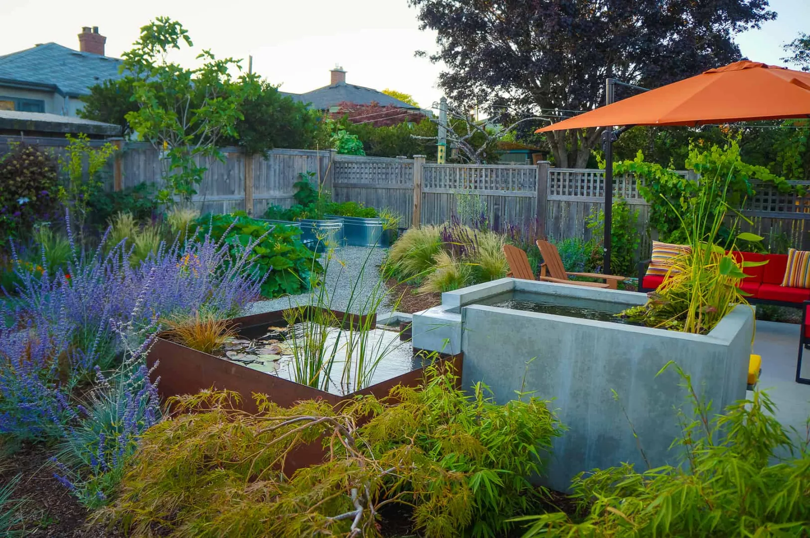 This modern home and its surrounding landscape celebrate color, texture, and seamless indoor-outdoor living. Water, fire, and the movement of perennials and grasses define the theme for this garden. A striking drystone wall and bluestone flagstone entrance set the stage, leading to a corten steel water feature that introduces movement and reflection. Winding pea gravel paths guide visitors through a backyard oasis framed by bamboo for privacy, where vibrant plantings surround a corten steel and concrete water feature, a fire pit, and a productive garden. A green roof wraps around the master suite and rooftop patio, enhancing sustainability while softening the architecture. Designed for both tranquility and community, the space incorporates geometric water features, a steel fire table, and a custom book box and bench to encourage neighborhood connection. Drought-tolerant plantings ensure year-round visual interest, privacy, and a thriving habitat for wildlife.