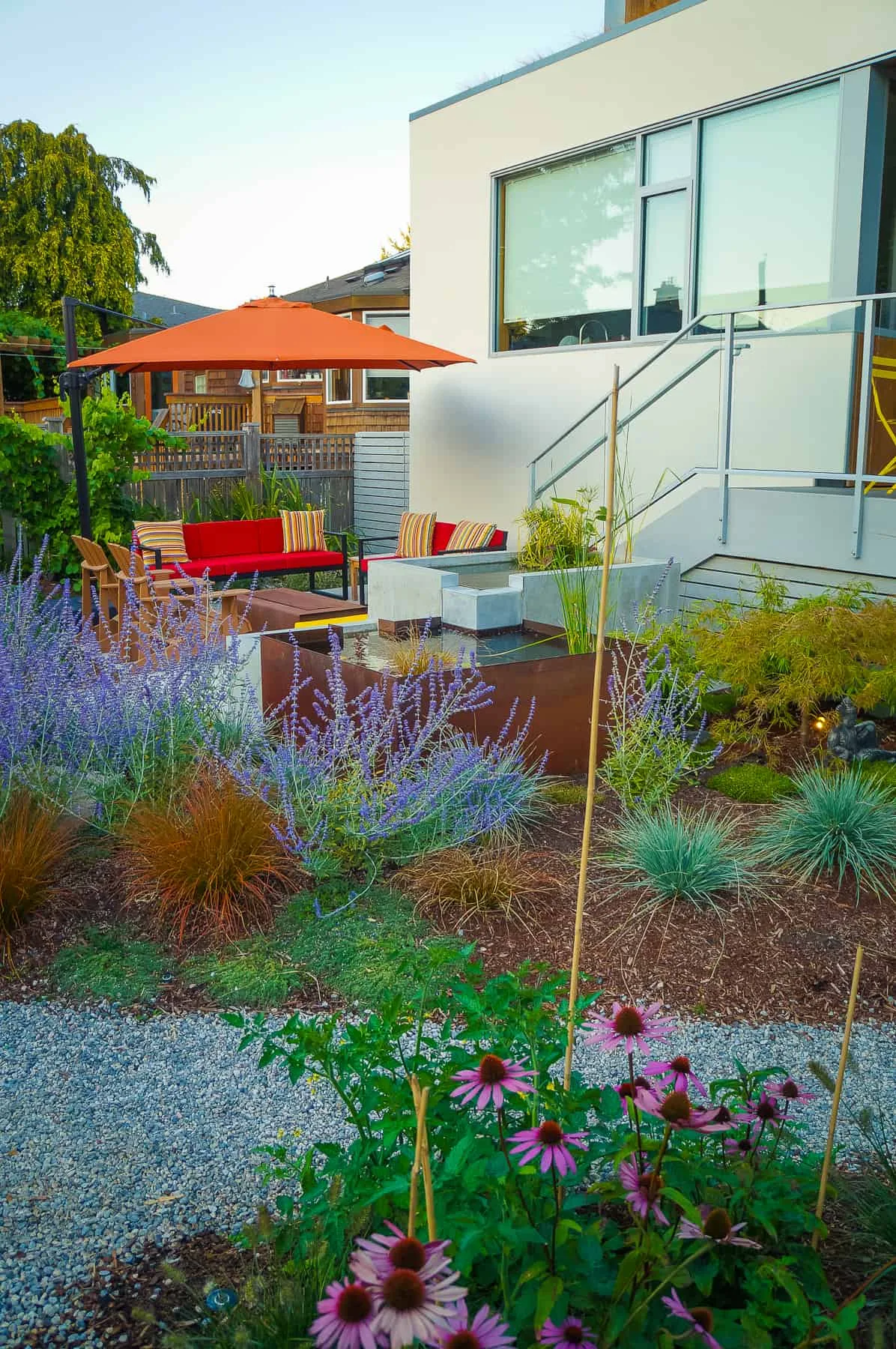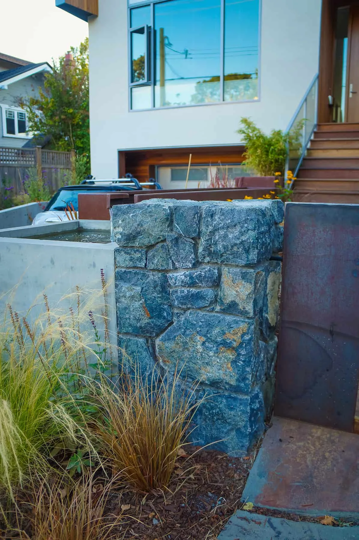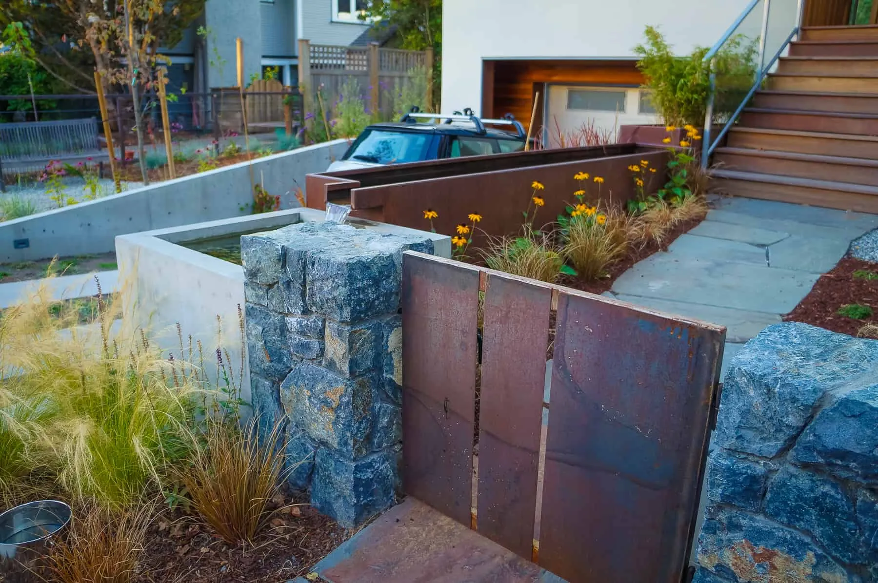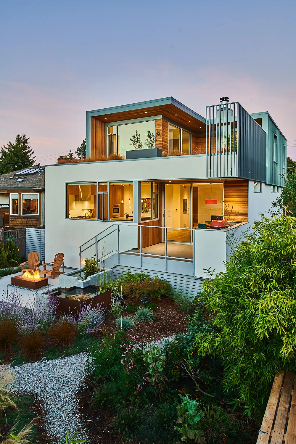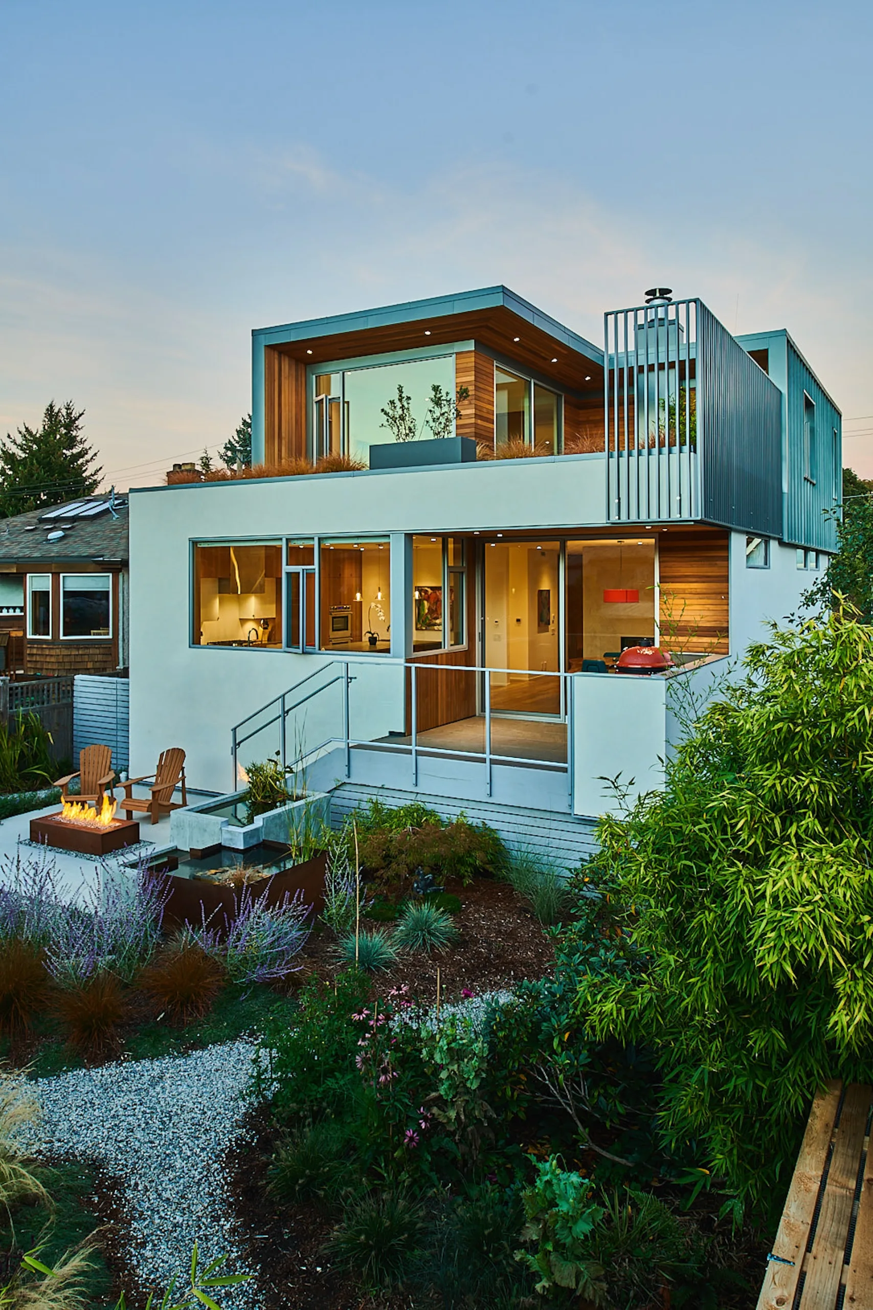 This modern home and its surrounding landscape celebrate color, texture, and seamless indoor-outdoor living. Water, fire, and the movement of perennials and grasses define the theme for this garden. A striking drystone wall and bluestone flagstone entrance set the stage, leading to a corten steel water feature that introduces movement and reflection. Winding pea gravel paths guide visitors through a backyard oasis framed by bamboo for privacy, where vibrant plantings surround a corten steel and concrete water feature, a fire pit, and a productive garden. A green roof wraps around the master suite and rooftop patio, enhancing sustainability while softening the architecture. Designed for both tranquility and community, the space incorporates geometric water features, a steel fire table, and a custom book box and bench to encourage neighborhood connection. Drought-tolerant plantings ensure year-round visual interest, privacy, and a thriving habitat for wildlife.