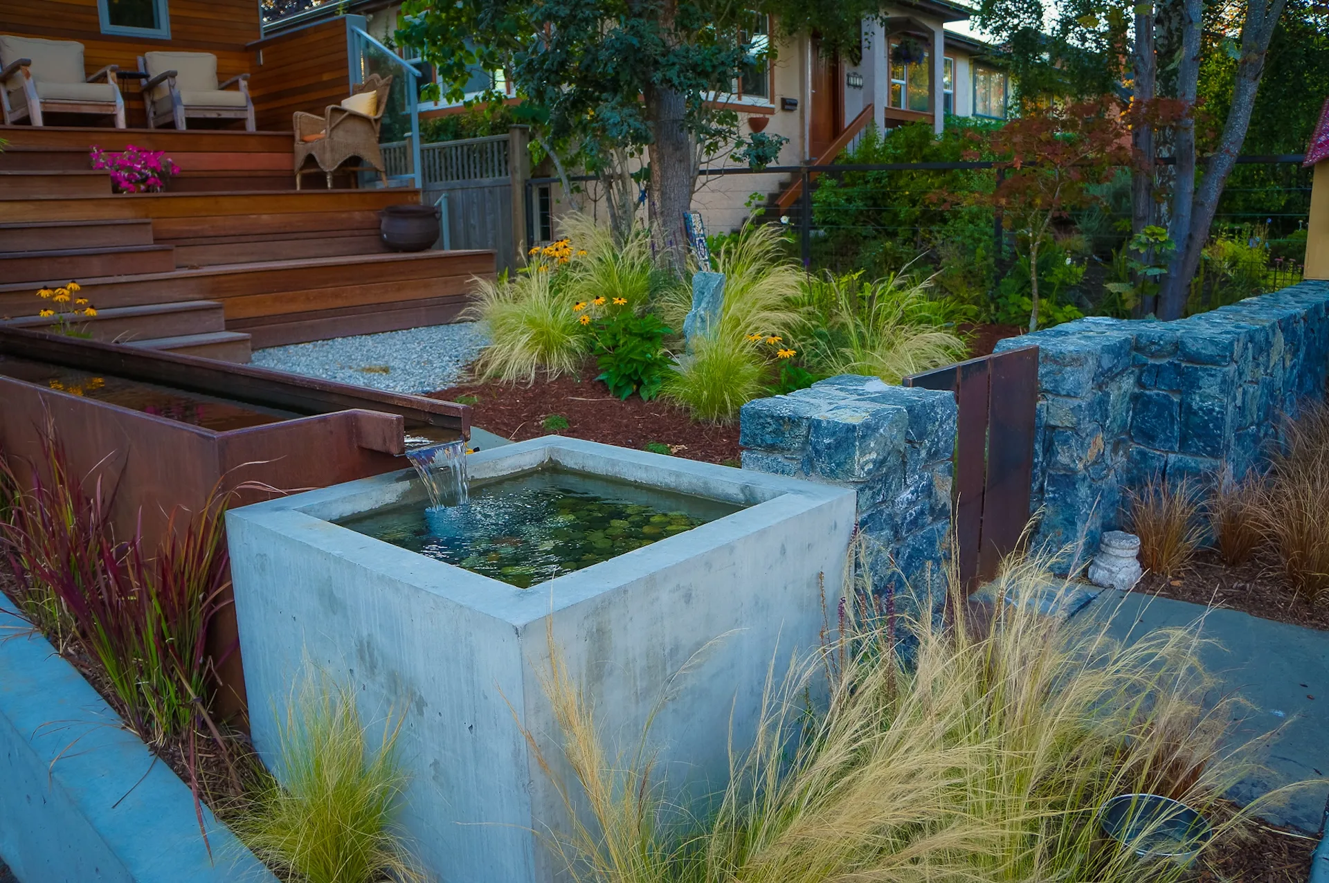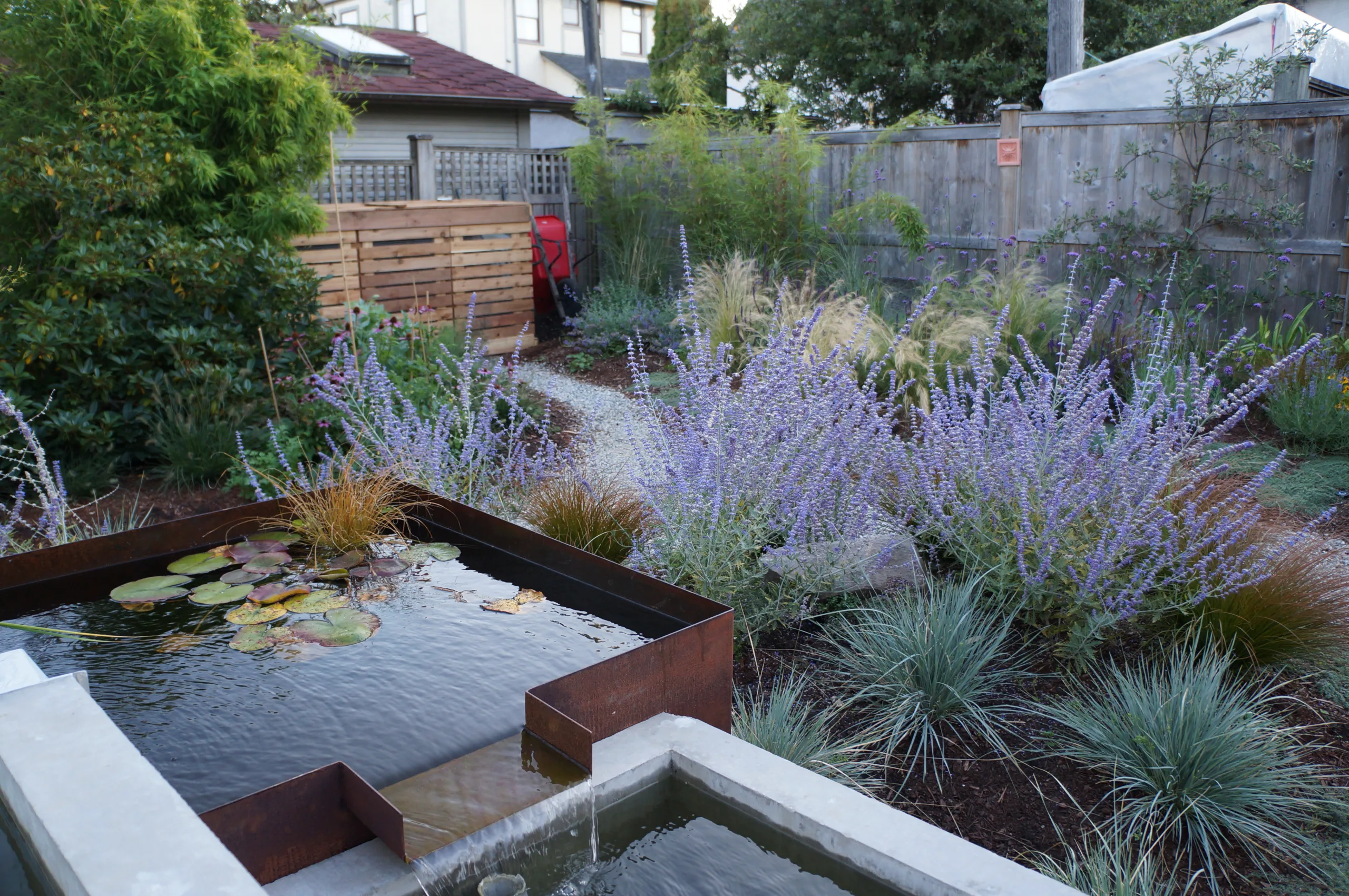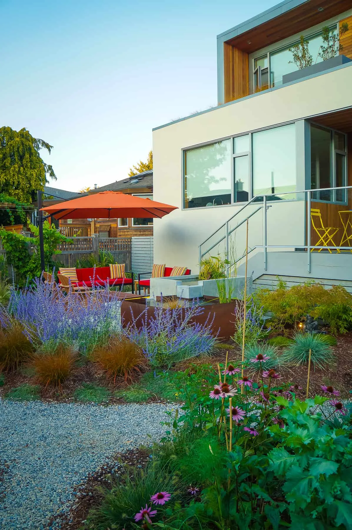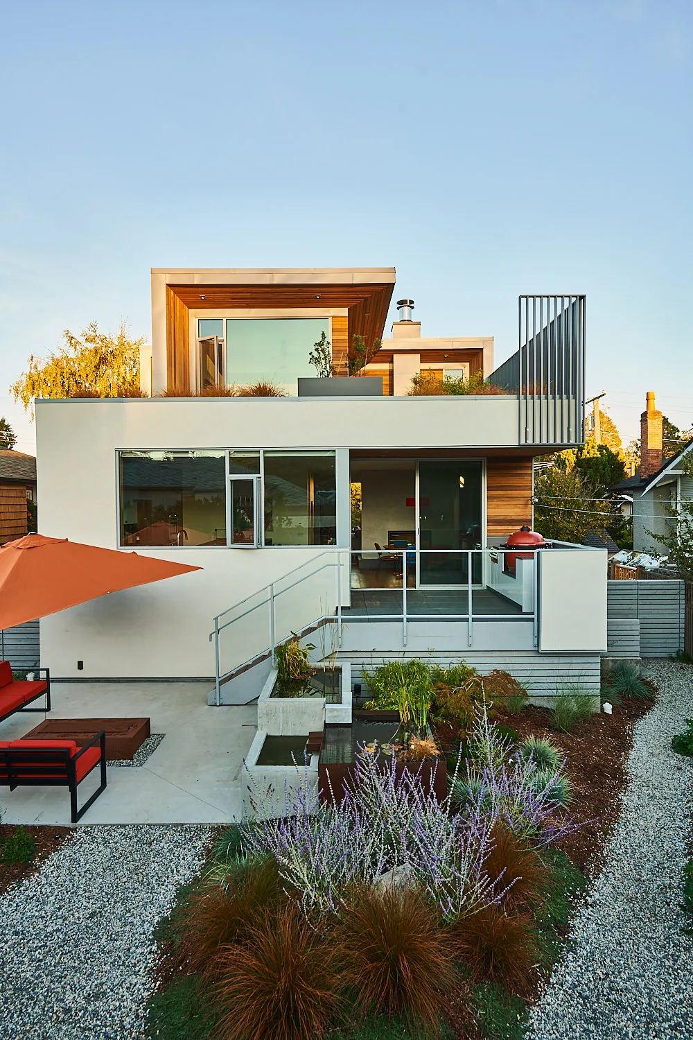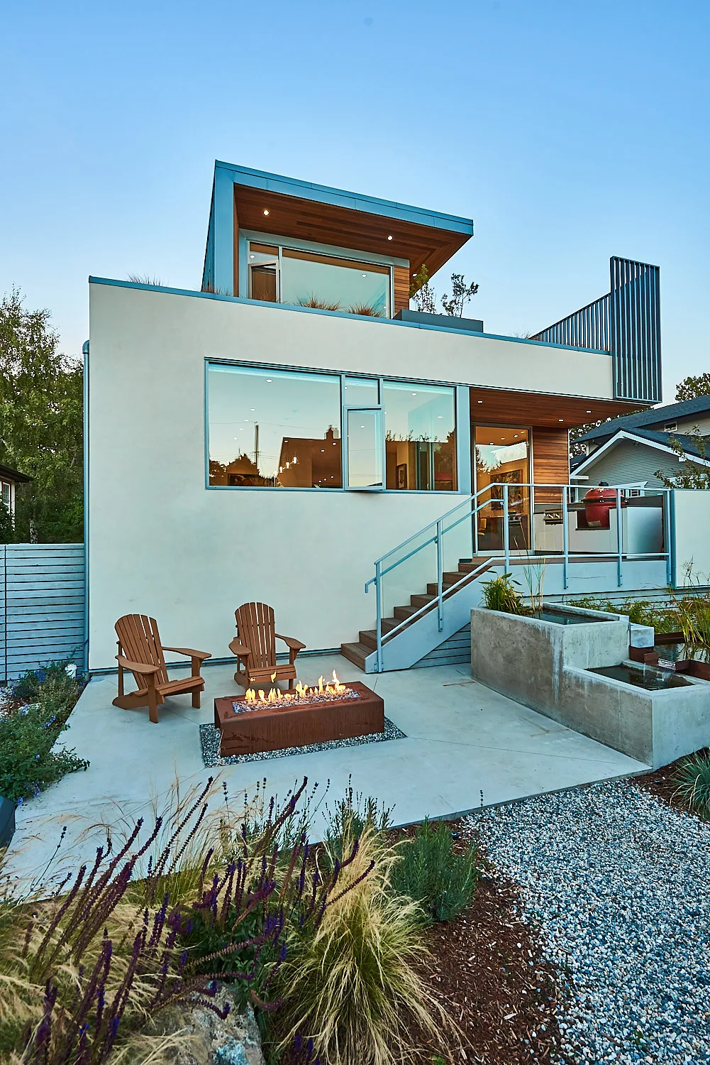 This modern home and its surrounding landscape celebrate color, texture, and seamless indoor-outdoor living. Water, fire, and the movement of perennials and grasses define the theme for this garden. A striking drystone wall and bluestone flagstone entrance set the stage, leading to a corten steel water feature that introduces movement and reflection. Winding pea gravel paths guide visitors through a backyard oasis framed by bamboo for privacy, where vibrant plantings surround a corten steel and concrete water feature, a fire pit, and a productive garden. A green roof wraps around the master suite and rooftop patio, enhancing sustainability while softening the architecture. Designed for both tranquility and community, the space incorporates geometric water features, a steel fire table, and a custom book box and bench to encourage neighborhood connection. Drought-tolerant plantings ensure year-round visual interest, privacy, and a thriving habitat for wildlife.