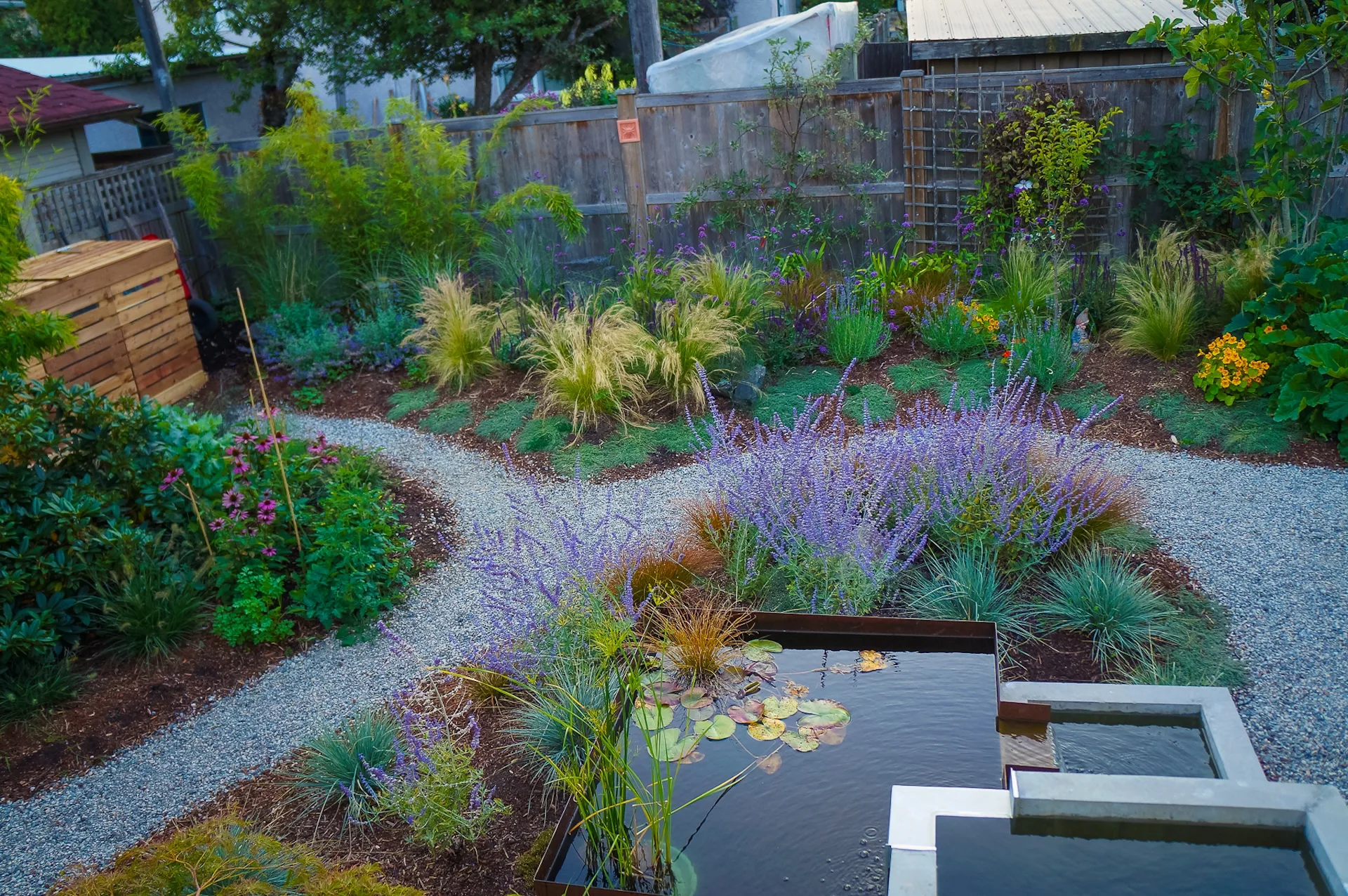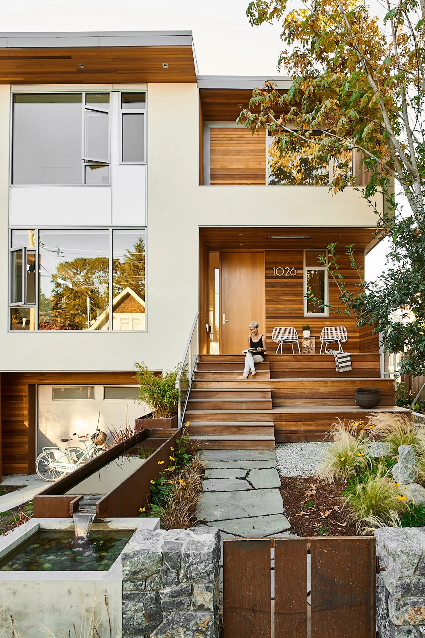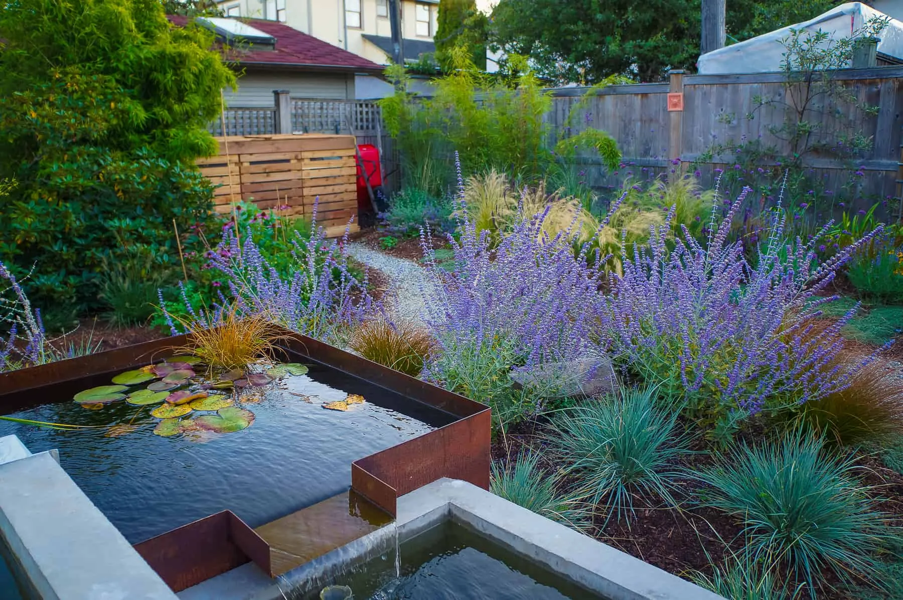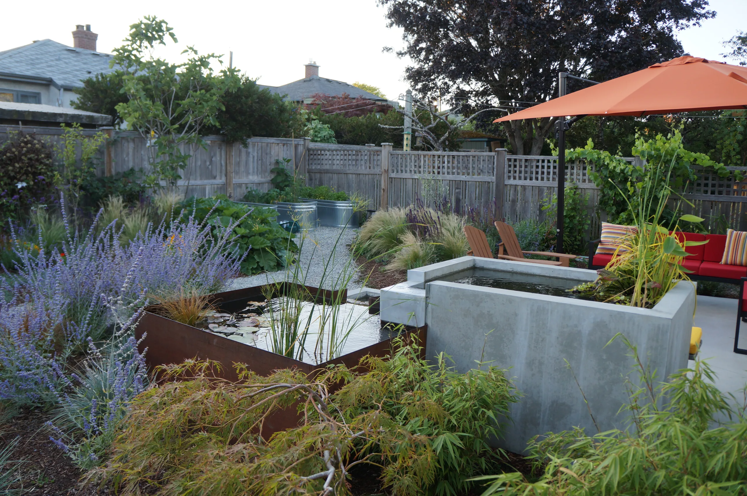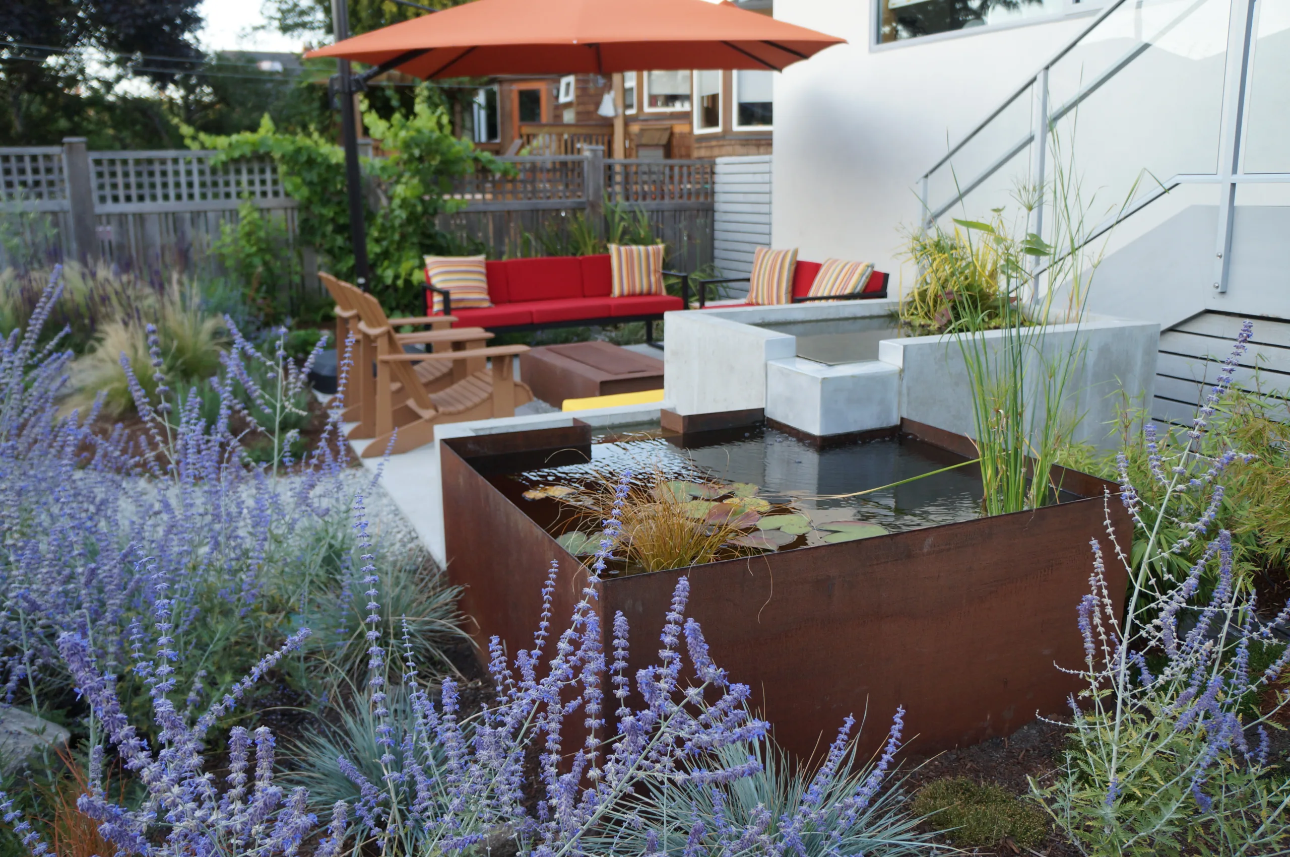This modern home and its surrounding landscape celebrate color, texture, and seamless indoor-outdoor living. Water, fire, and the movement of perennials and grasses define the theme for this garden. A striking drystone wall and bluestone flagstone entrance set the stage, leading to a corten steel water feature that introduces movement and reflection. Winding pea gravel paths guide visitors through a backyard oasis framed by bamboo for privacy, where vibrant plantings surround a corten steel and concrete water feature, a fire pit, and a productive garden. A green roof wraps around the master suite and rooftop patio, enhancing sustainability while softening the architecture. Designed for both tranquility and community, the space incorporates geometric water features, a steel fire table, and a custom book box and bench to encourage neighborhood connection. Drought-tolerant plantings ensure year-round visual interest, privacy, and a thriving habitat for wildlife.