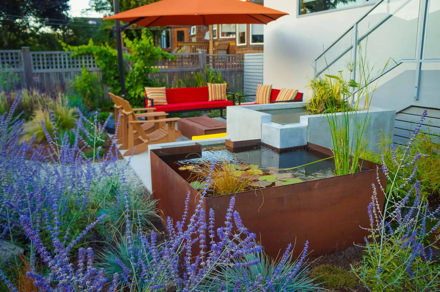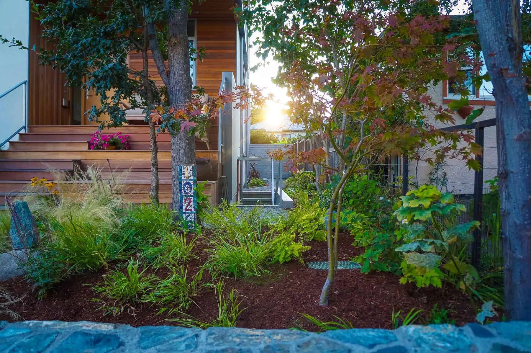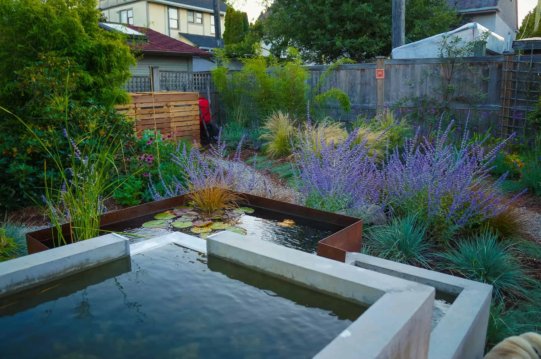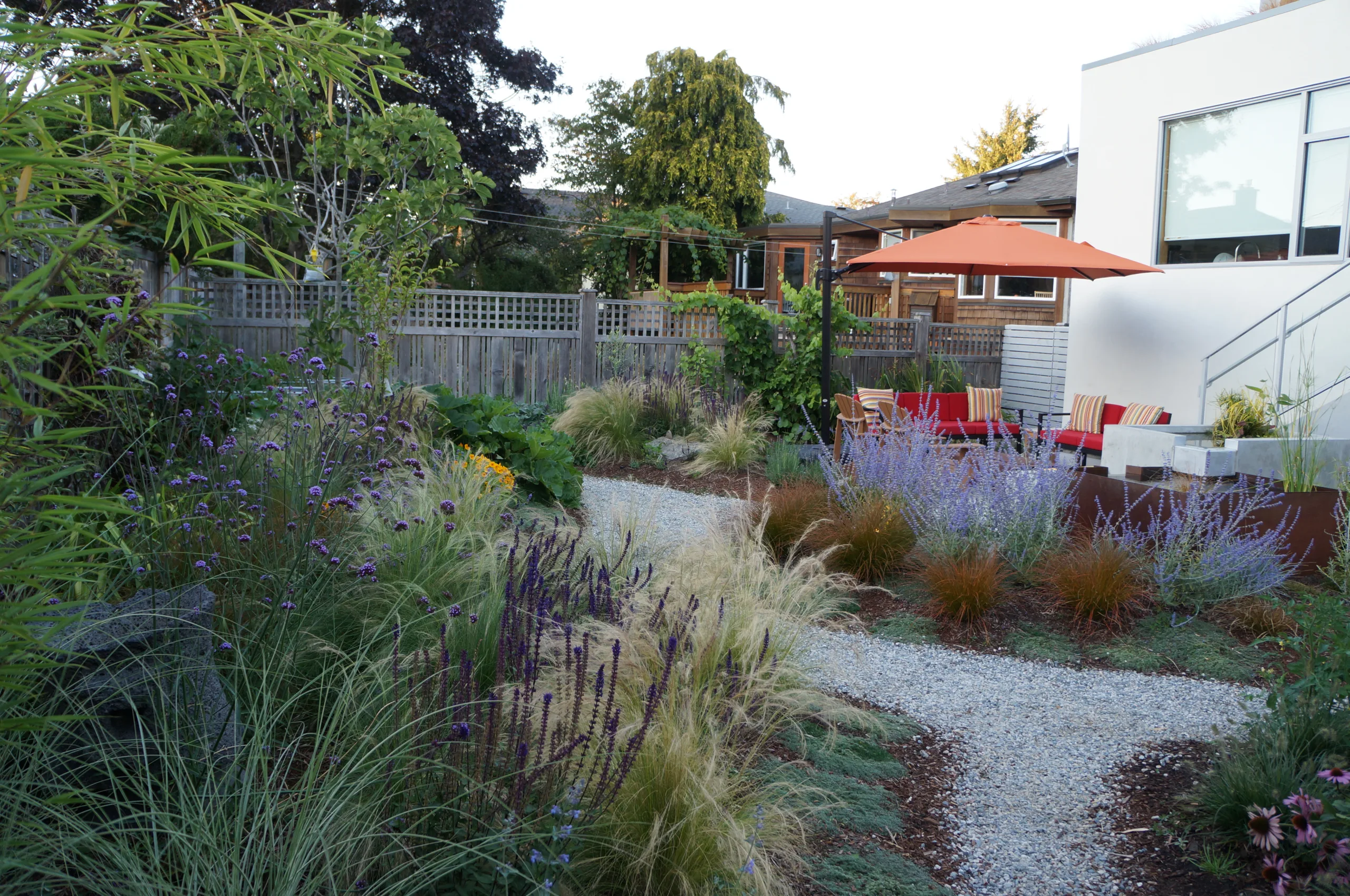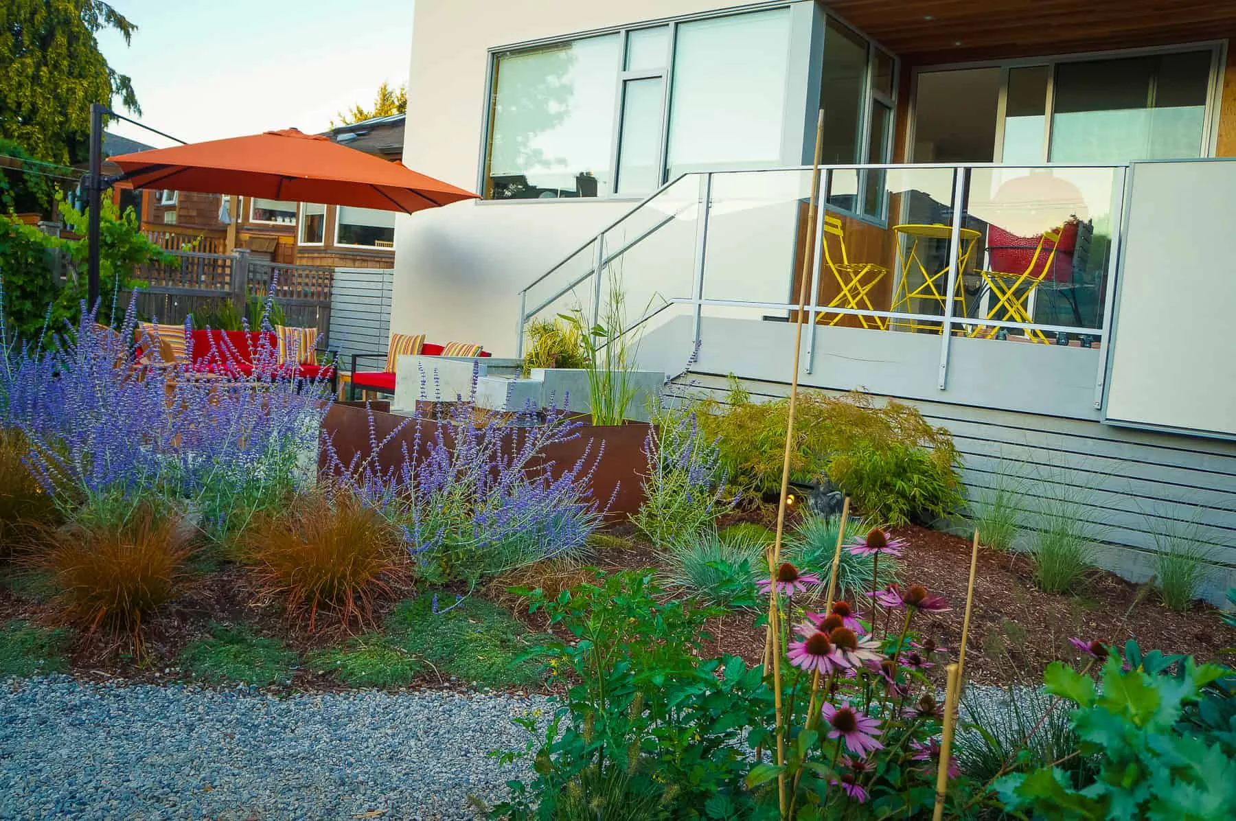 This modern home and its surrounding landscape celebrate color, texture, and seamless indoor-outdoor living. Water, fire, and the movement of perennials and grasses define the theme for this garden. A striking drystone wall and bluestone flagstone entrance set the stage, leading to a corten steel water feature that introduces movement and reflection. Winding pea gravel paths guide visitors through a backyard oasis framed by bamboo for privacy, where vibrant plantings surround a corten steel and concrete water feature, a fire pit, and a productive garden. A green roof wraps around the master suite and rooftop patio, enhancing sustainability while softening the architecture. Designed for both tranquility and community, the space incorporates geometric water features, a steel fire table, and a custom book box and bench to encourage neighborhood connection. Drought-tolerant plantings ensure year-round visual interest, privacy, and a thriving habitat for wildlife.