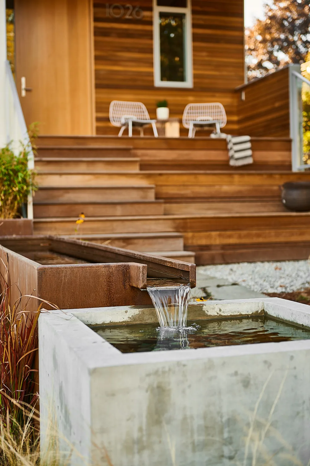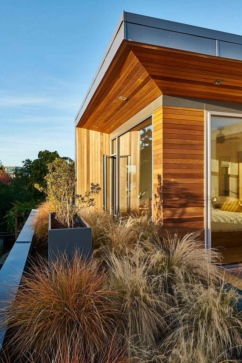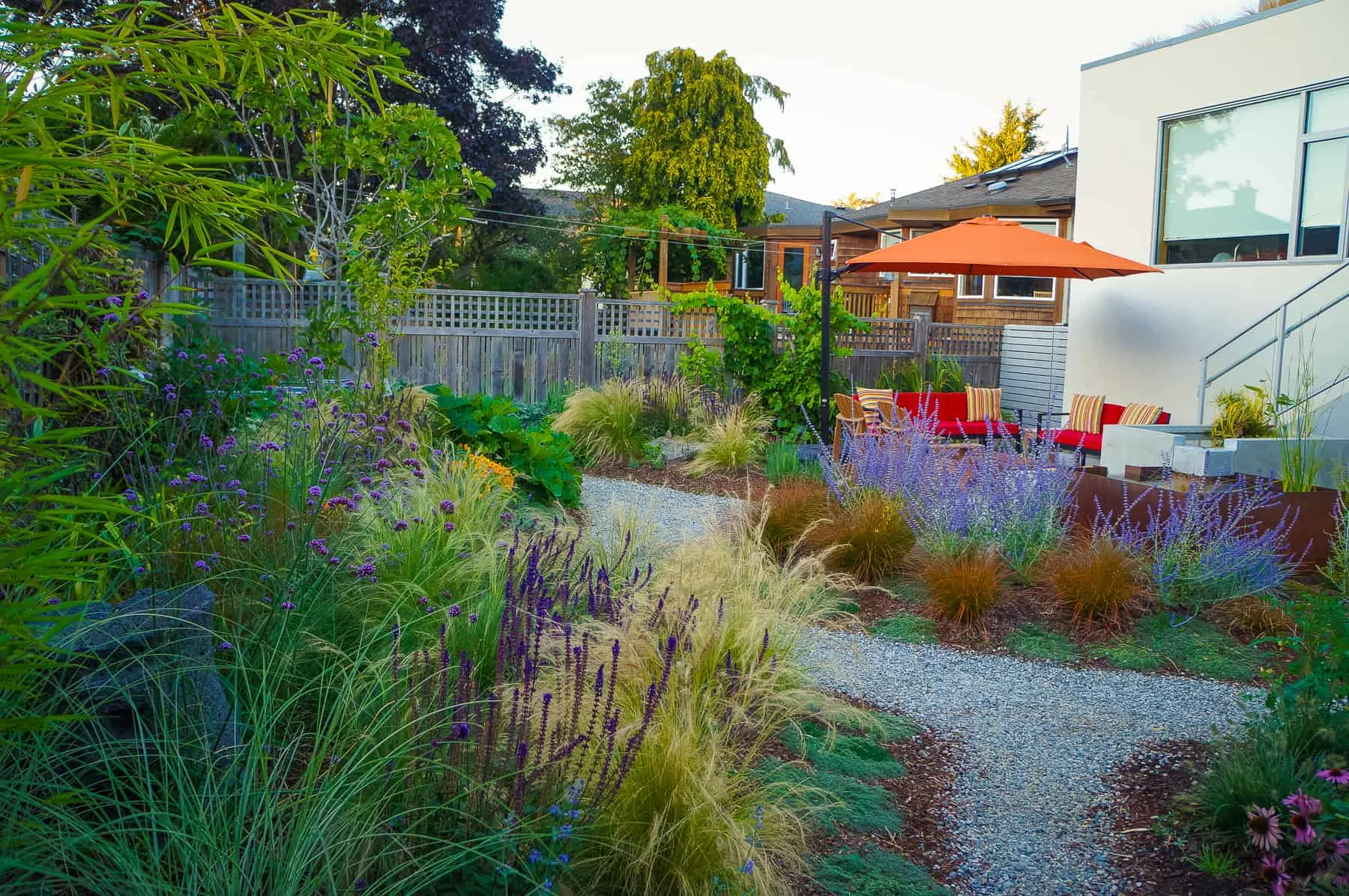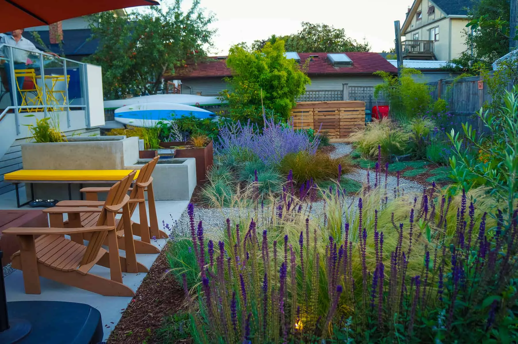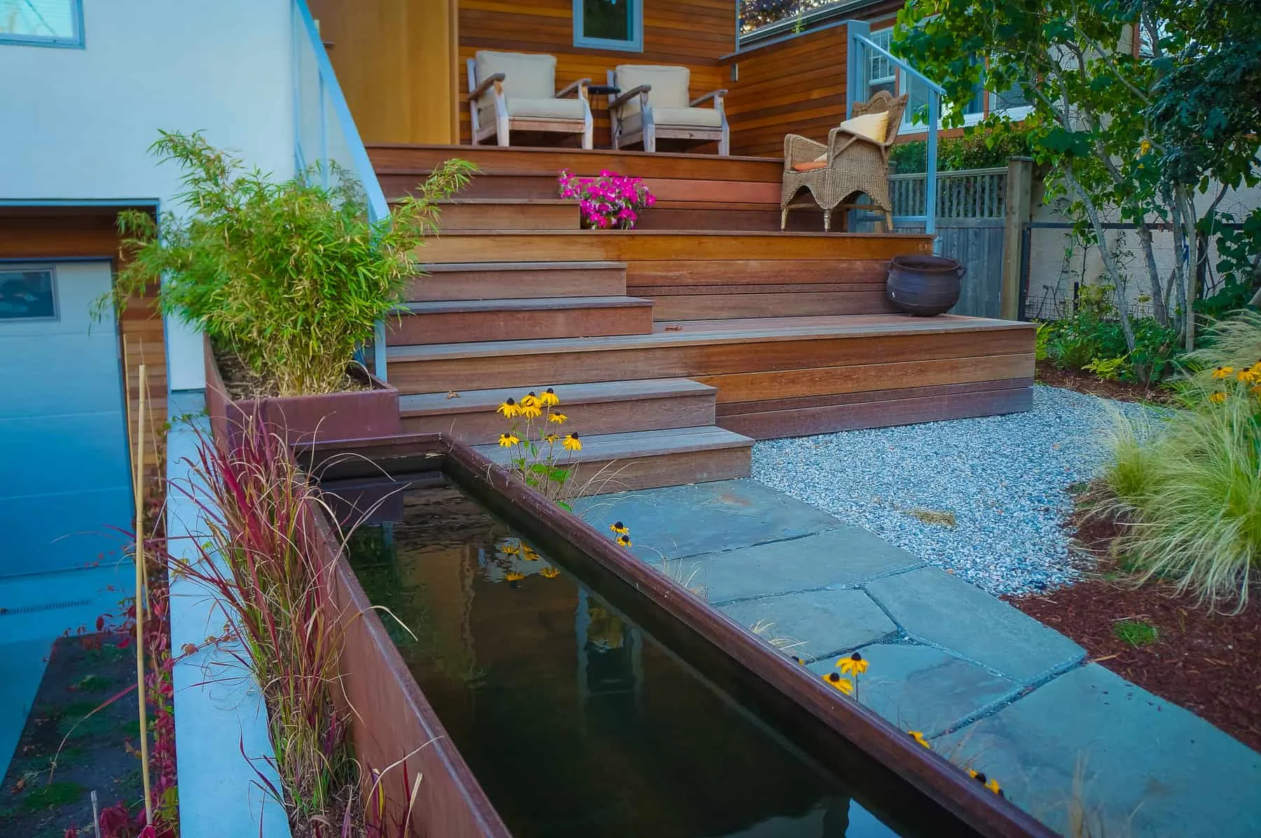 This modern home and its surrounding landscape celebrate color, texture, and seamless indoor-outdoor living. Water, fire, and the movement of perennials and grasses define the theme for this garden. A striking drystone wall and bluestone flagstone entrance set the stage, leading to a corten steel water feature that introduces movement and reflection. Winding pea gravel paths guide visitors through a backyard oasis framed by bamboo for privacy, where vibrant plantings surround a corten steel and concrete water feature, a fire pit, and a productive garden. A green roof wraps around the master suite and rooftop patio, enhancing sustainability while softening the architecture. Designed for both tranquility and community, the space incorporates geometric water features, a steel fire table, and a custom book box and bench to encourage neighborhood connection. Drought-tolerant plantings ensure year-round visual interest, privacy, and a thriving habitat for wildlife.