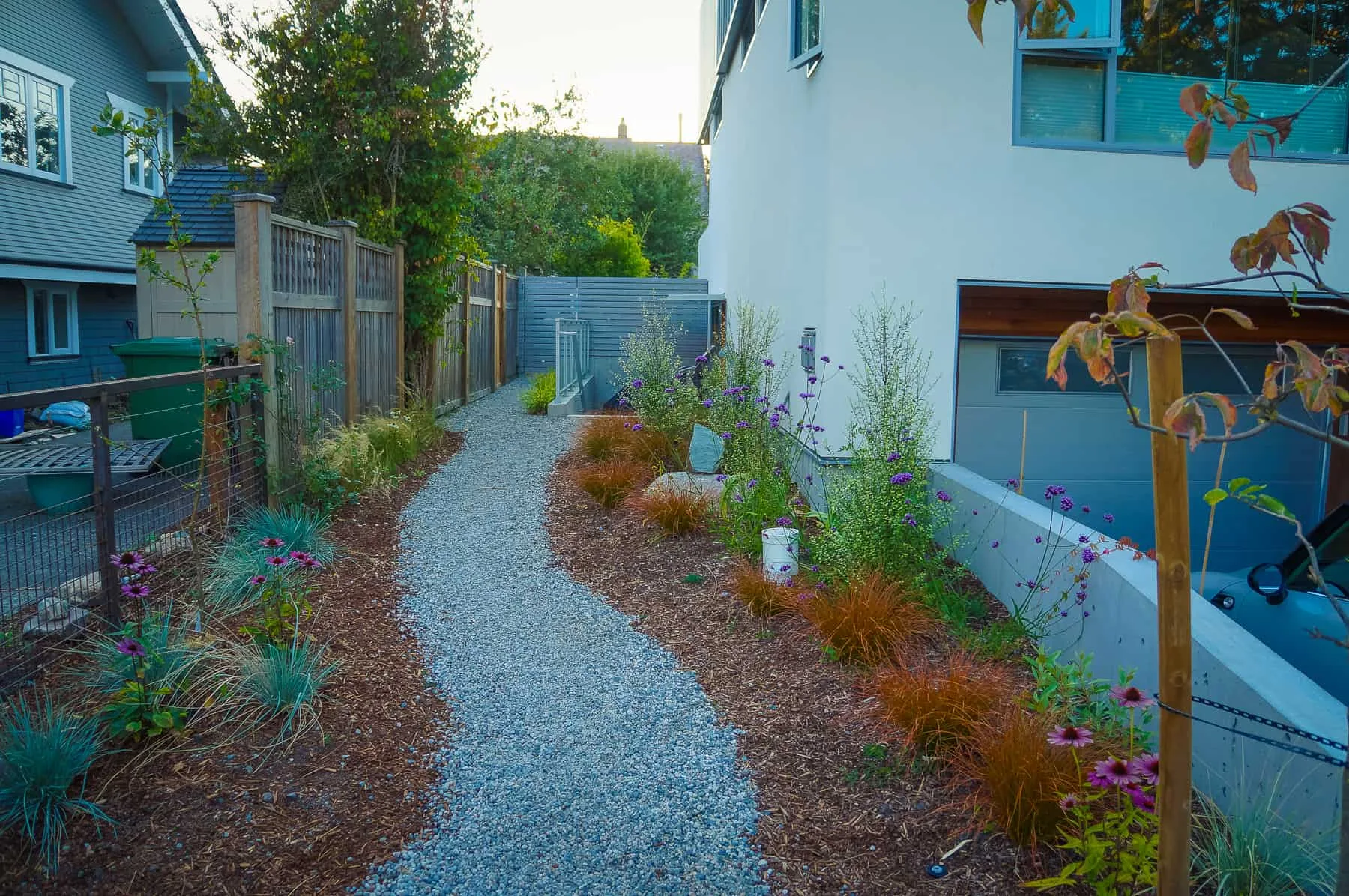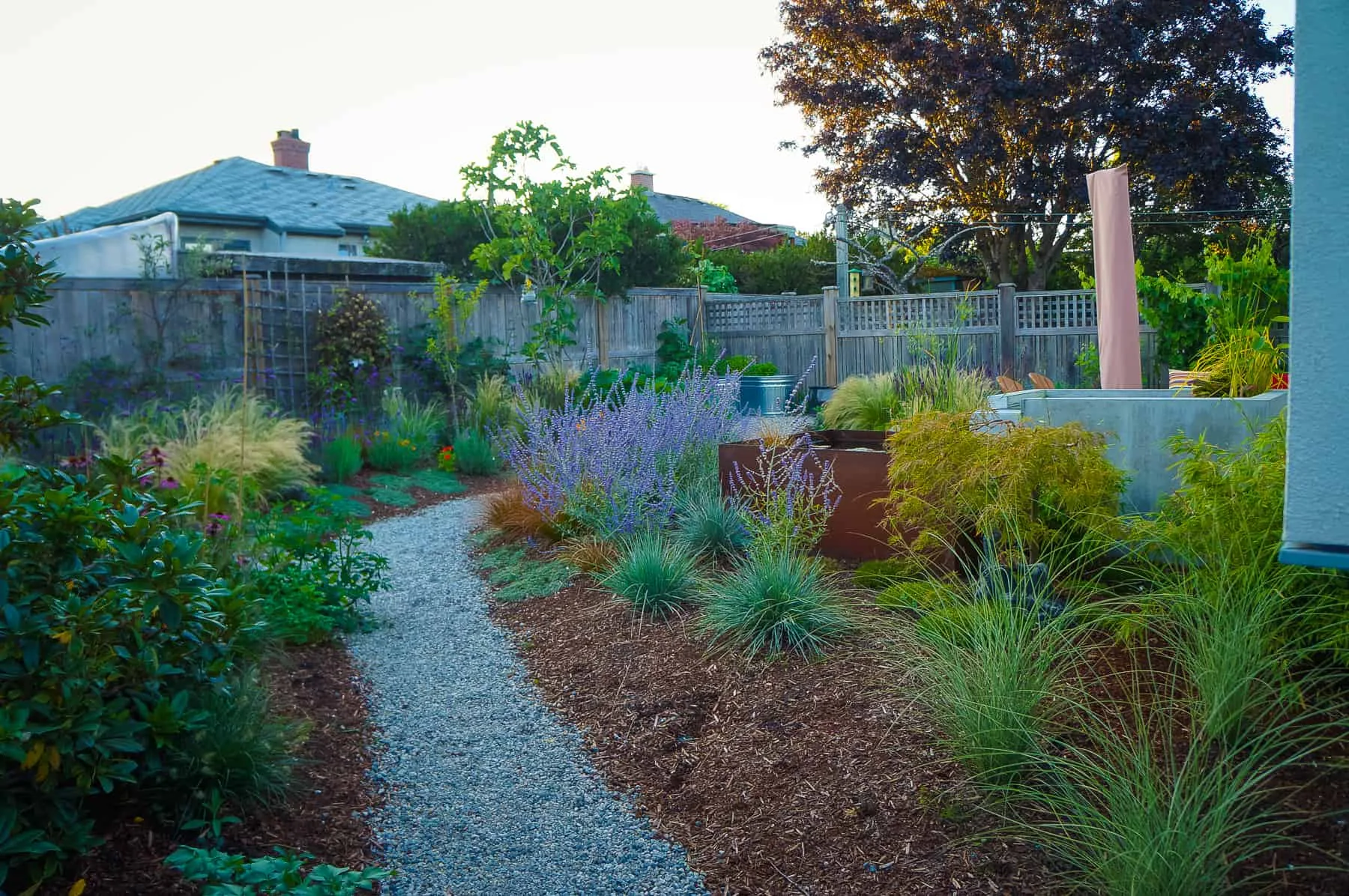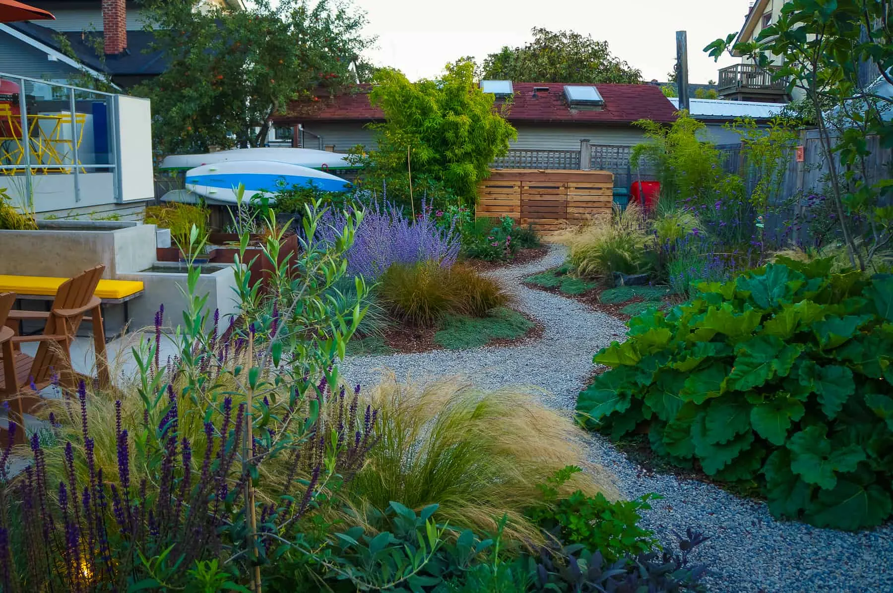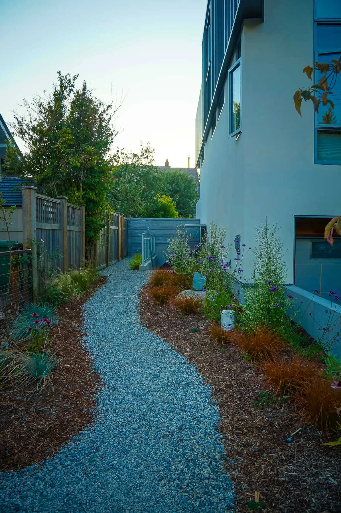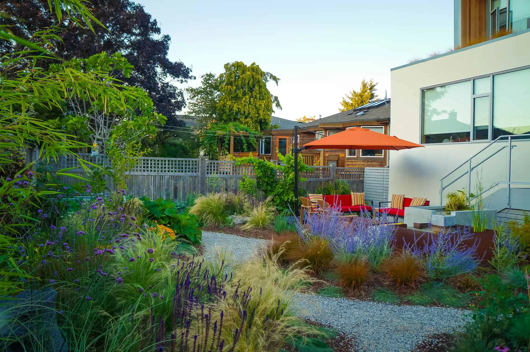 This modern home and its surrounding landscape celebrate color, texture, and seamless indoor-outdoor living. Water, fire, and the movement of perennials and grasses define the theme for this garden. A striking drystone wall and bluestone flagstone entrance set the stage, leading to a corten steel water feature that introduces movement and reflection. Winding pea gravel paths guide visitors through a backyard oasis framed by bamboo for privacy, where vibrant plantings surround a corten steel and concrete water feature, a fire pit, and a productive garden. A green roof wraps around the master suite and rooftop patio, enhancing sustainability while softening the architecture. Designed for both tranquility and community, the space incorporates geometric water features, a steel fire table, and a custom book box and bench to encourage neighborhood connection. Drought-tolerant plantings ensure year-round visual interest, privacy, and a thriving habitat for wildlife.