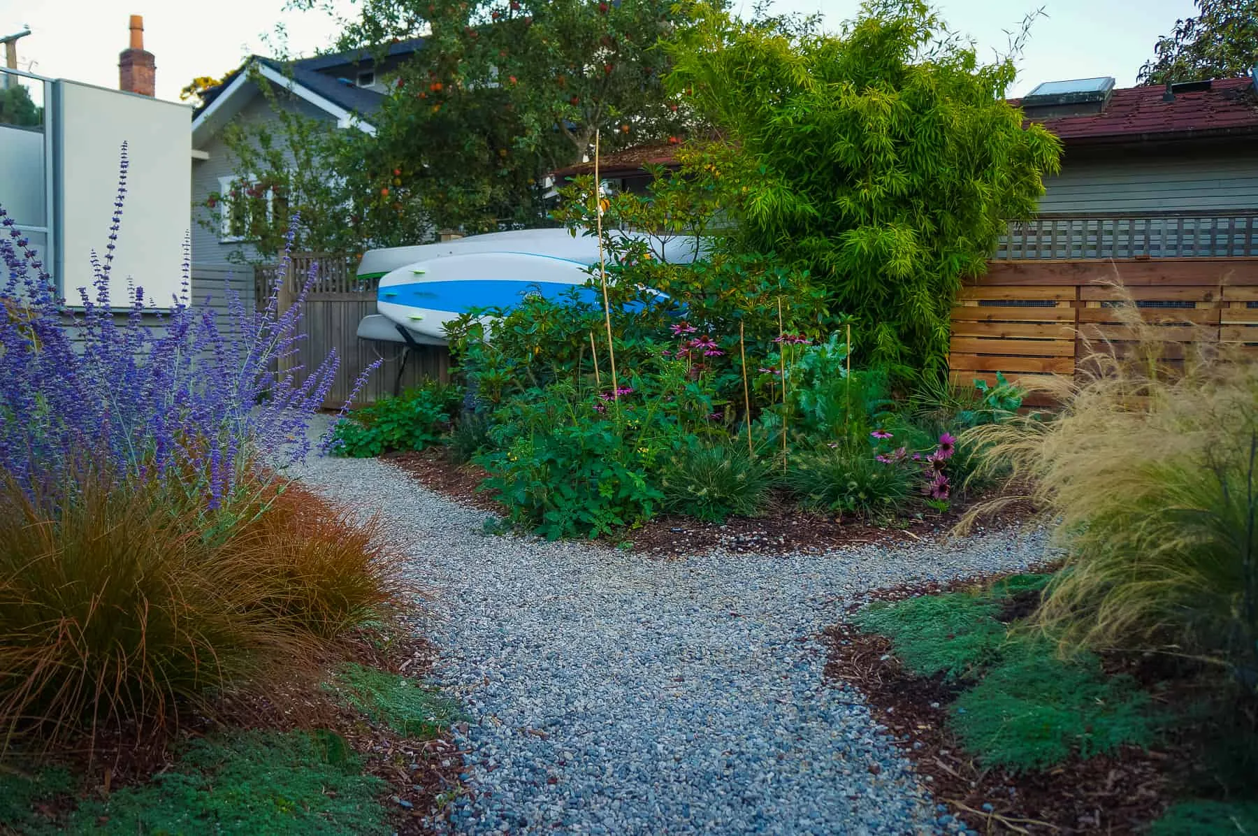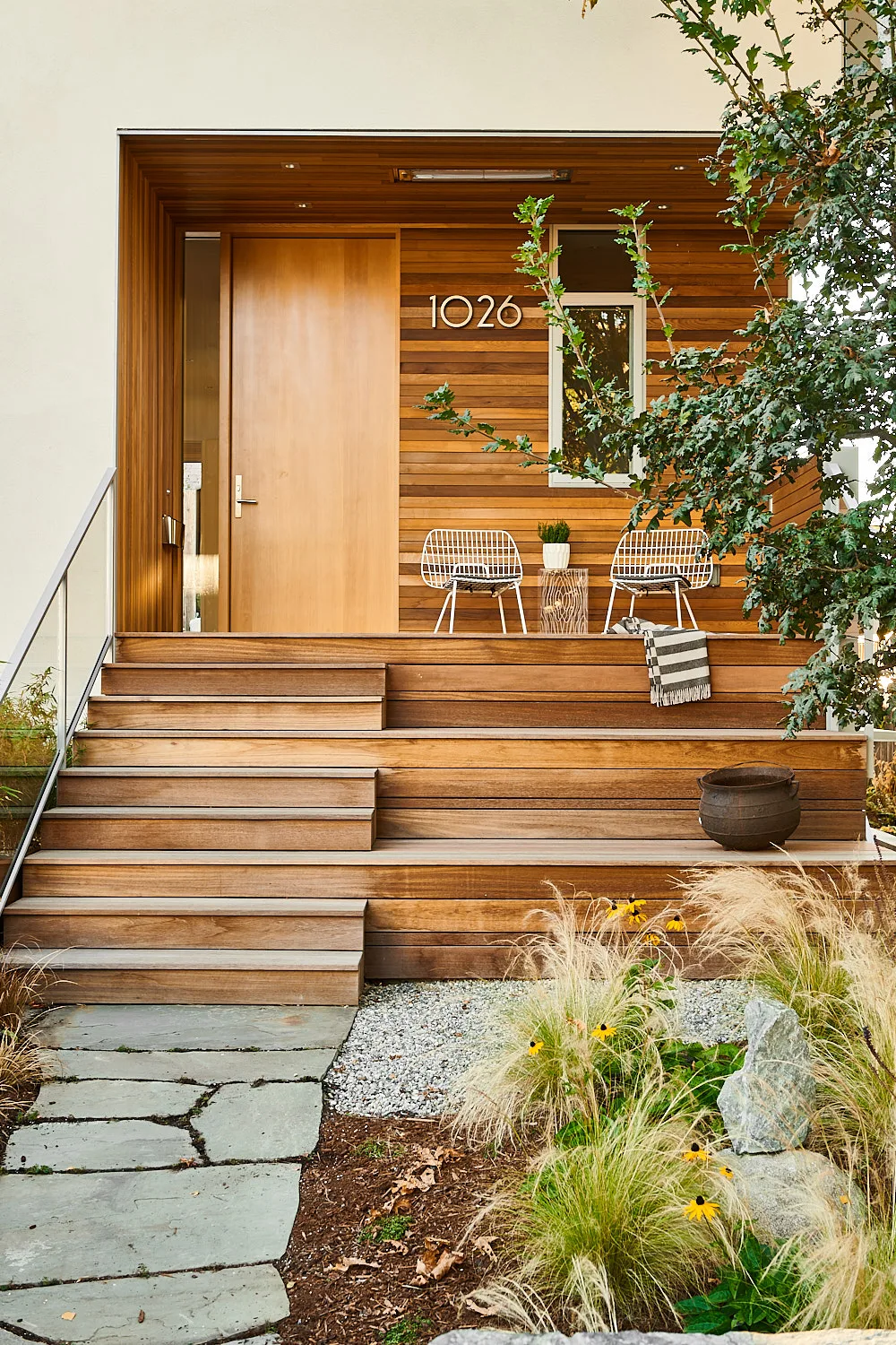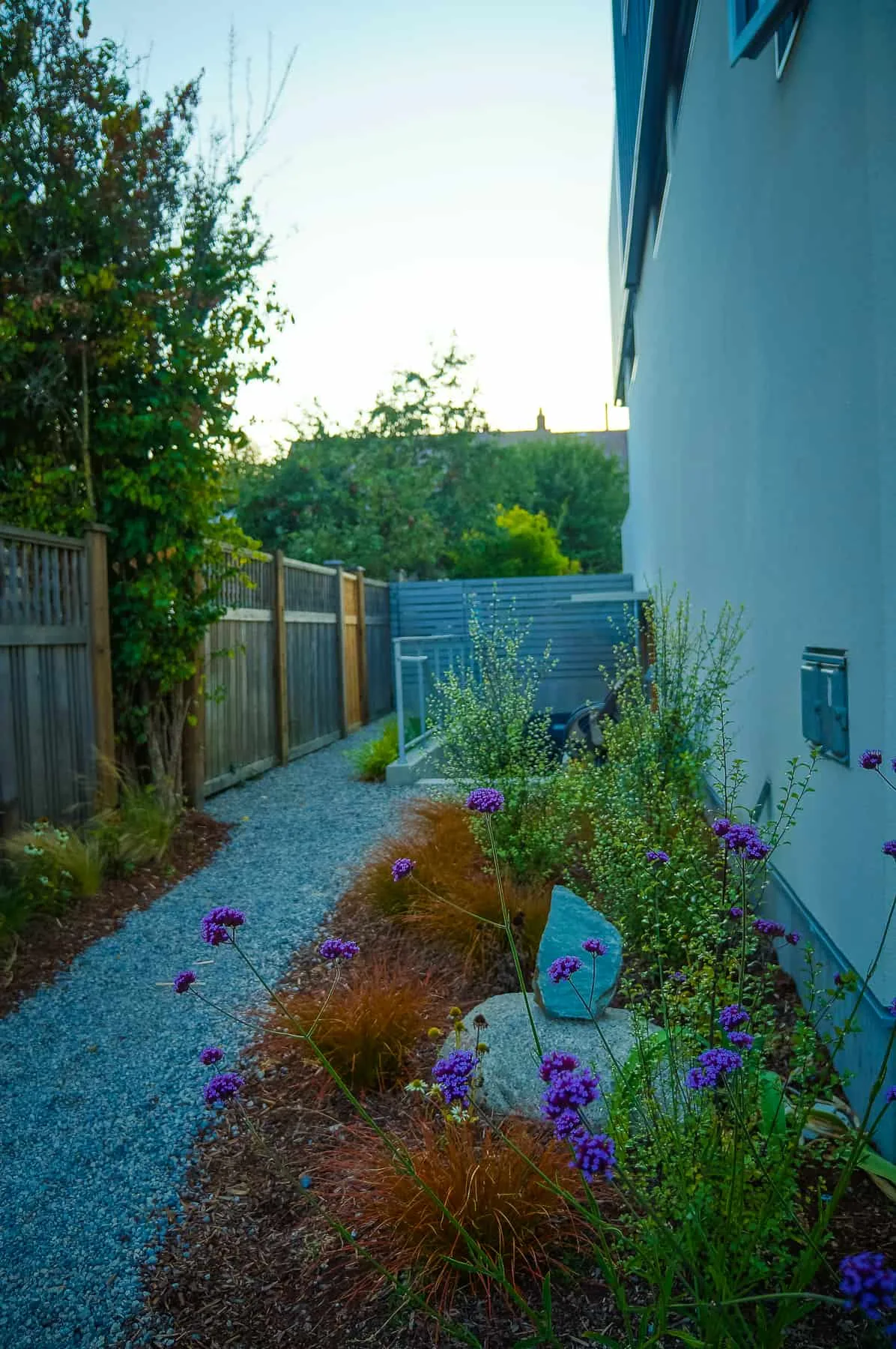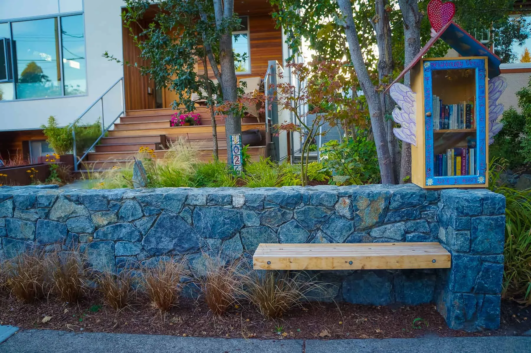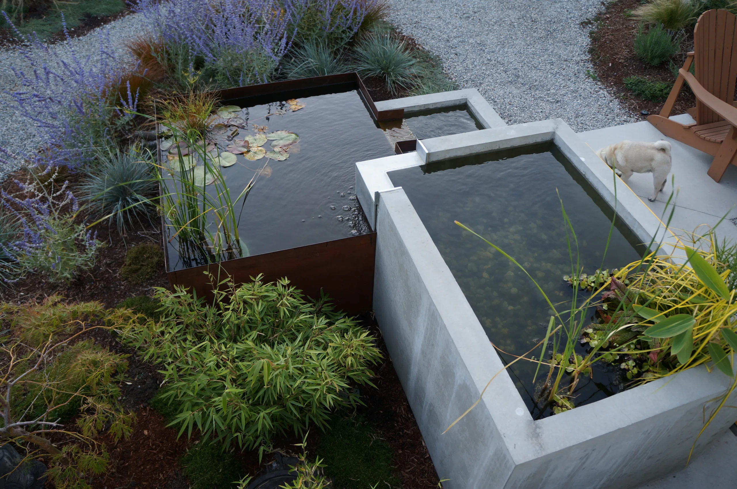 This modern home and its surrounding landscape celebrate color, texture, and seamless indoor-outdoor living. Water, fire, and the movement of perennials and grasses define the theme for this garden. A striking drystone wall and bluestone flagstone entrance set the stage, leading to a corten steel water feature that introduces movement and reflection. Winding pea gravel paths guide visitors through a backyard oasis framed by bamboo for privacy, where vibrant plantings surround a corten steel and concrete water feature, a fire pit, and a productive garden. A green roof wraps around the master suite and rooftop patio, enhancing sustainability while softening the architecture. Designed for both tranquility and community, the space incorporates geometric water features, a steel fire table, and a custom book box and bench to encourage neighborhood connection. Drought-tolerant plantings ensure year-round visual interest, privacy, and a thriving habitat for wildlife.