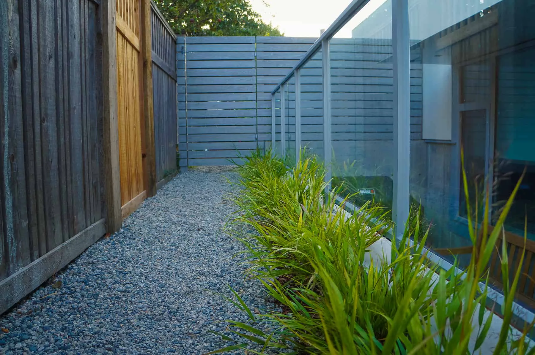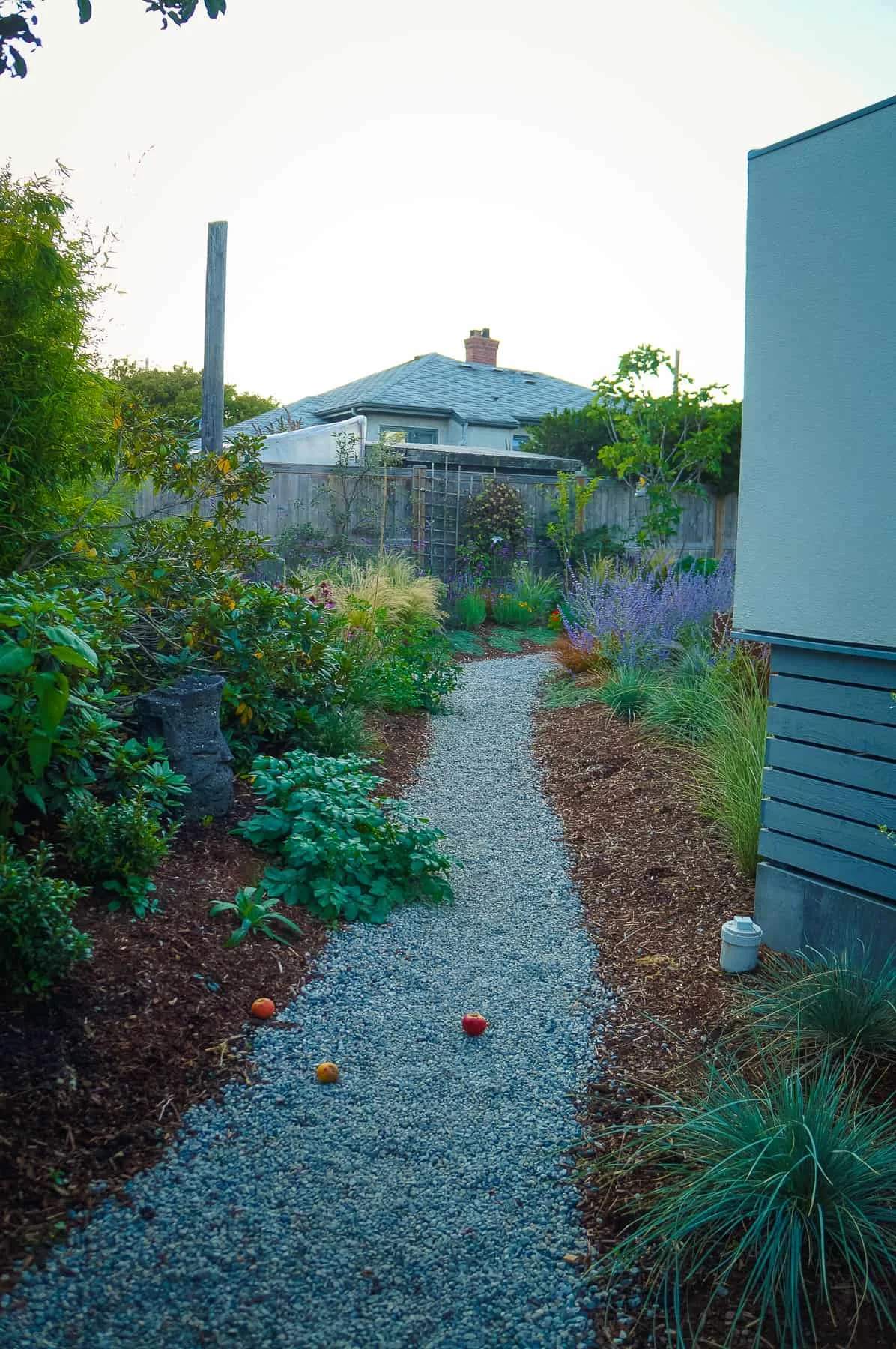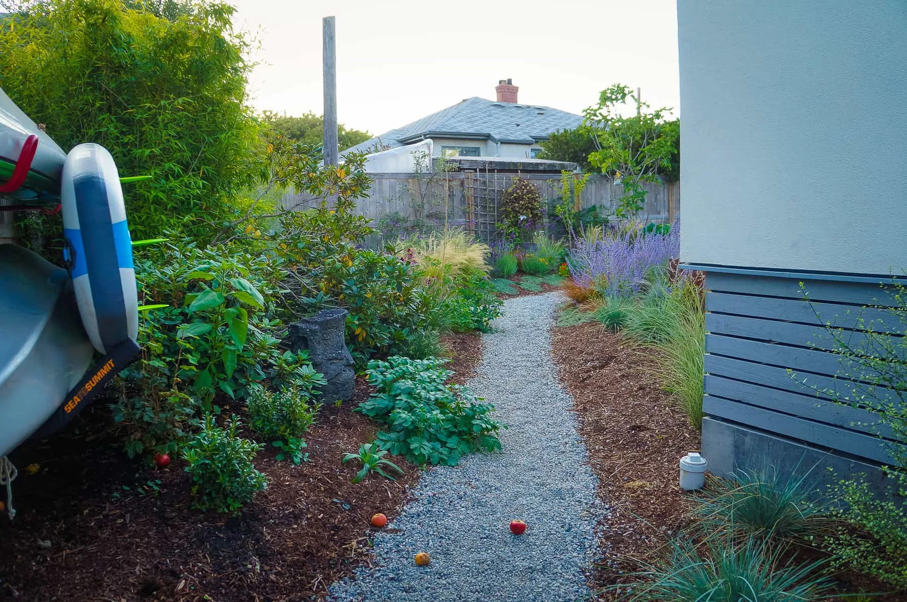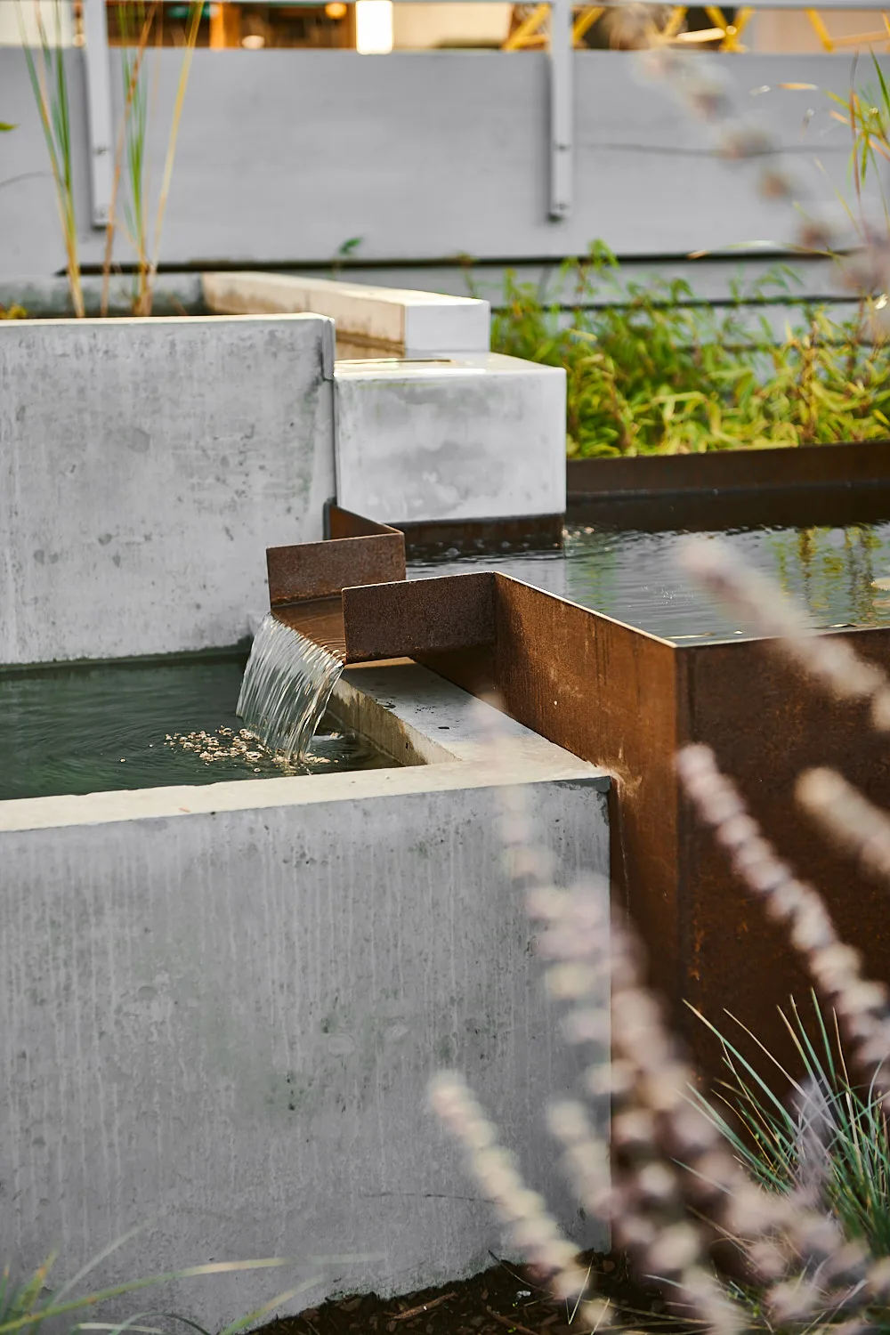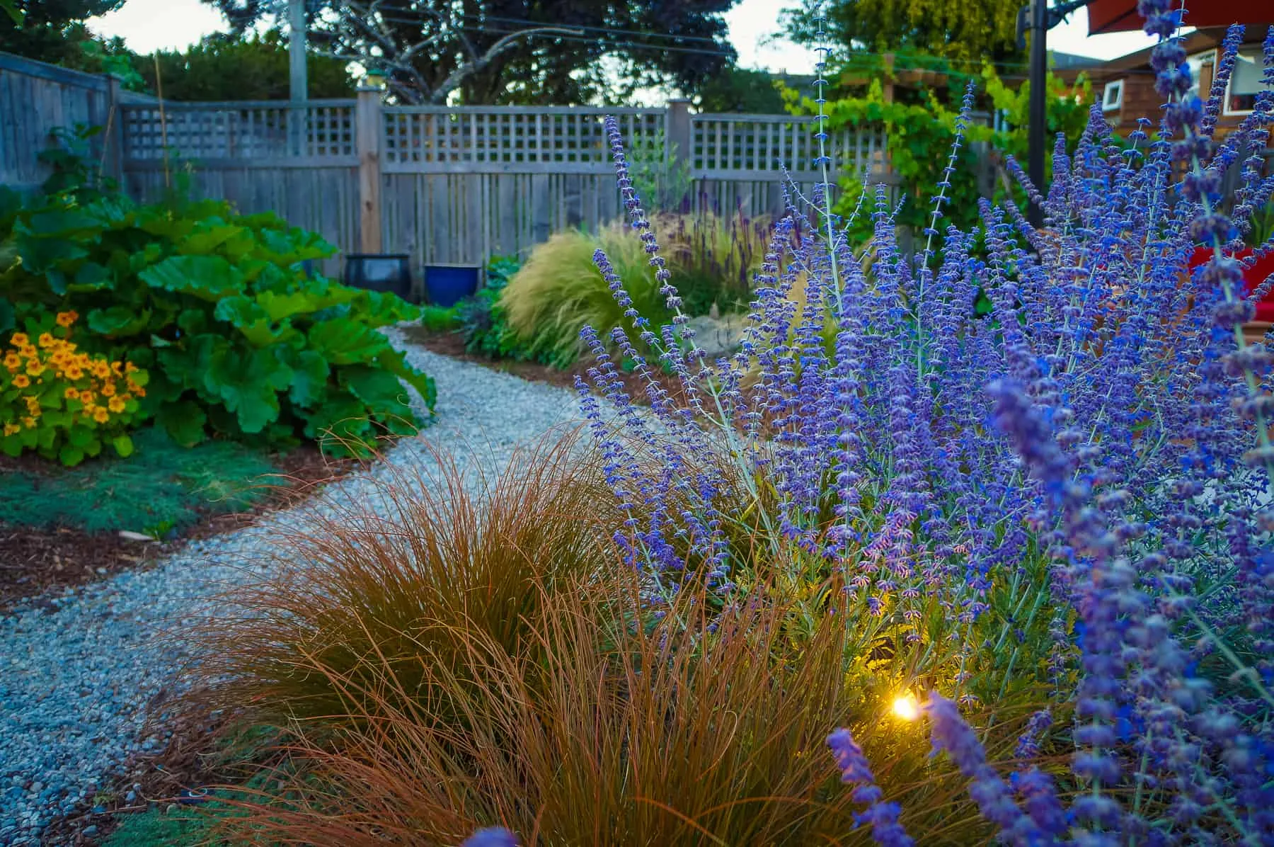 This modern home and its surrounding landscape celebrate color, texture, and seamless indoor-outdoor living. Water, fire, and the movement of perennials and grasses define the theme for this garden. A striking drystone wall and bluestone flagstone entrance set the stage, leading to a corten steel water feature that introduces movement and reflection. Winding pea gravel paths guide visitors through a backyard oasis framed by bamboo for privacy, where vibrant plantings surround a corten steel and concrete water feature, a fire pit, and a productive garden. A green roof wraps around the master suite and rooftop patio, enhancing sustainability while softening the architecture. Designed for both tranquility and community, the space incorporates geometric water features, a steel fire table, and a custom book box and bench to encourage neighborhood connection. Drought-tolerant plantings ensure year-round visual interest, privacy, and a thriving habitat for wildlife.