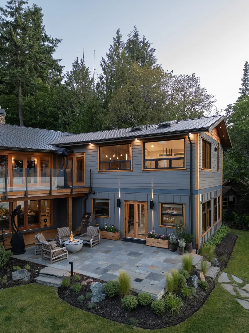 This Cape Cod-style renovation provides a secluded coastal retreat, accessed through a winding driveway that meanders beneath a canopy of towering cedars and ferns. The entryway is defined by meticulously fitted bluestone in an ashlar pattern, leading to a series of basalt risers that descend toward a lower patio. Here, a thoughtfully designed outdoor living space awaits, complete with a built-in fire pit, BBQ area, and splash pad, offering a perfect balance of relaxation and entertainment. The natural surroundings enhance the sense of privacy, while the integration of classic coastal elements ensures a timeless aesthetic. Blending West Coast beauty with Cape Cod charm, this waterfront sanctuary is both inviting and enduring.
