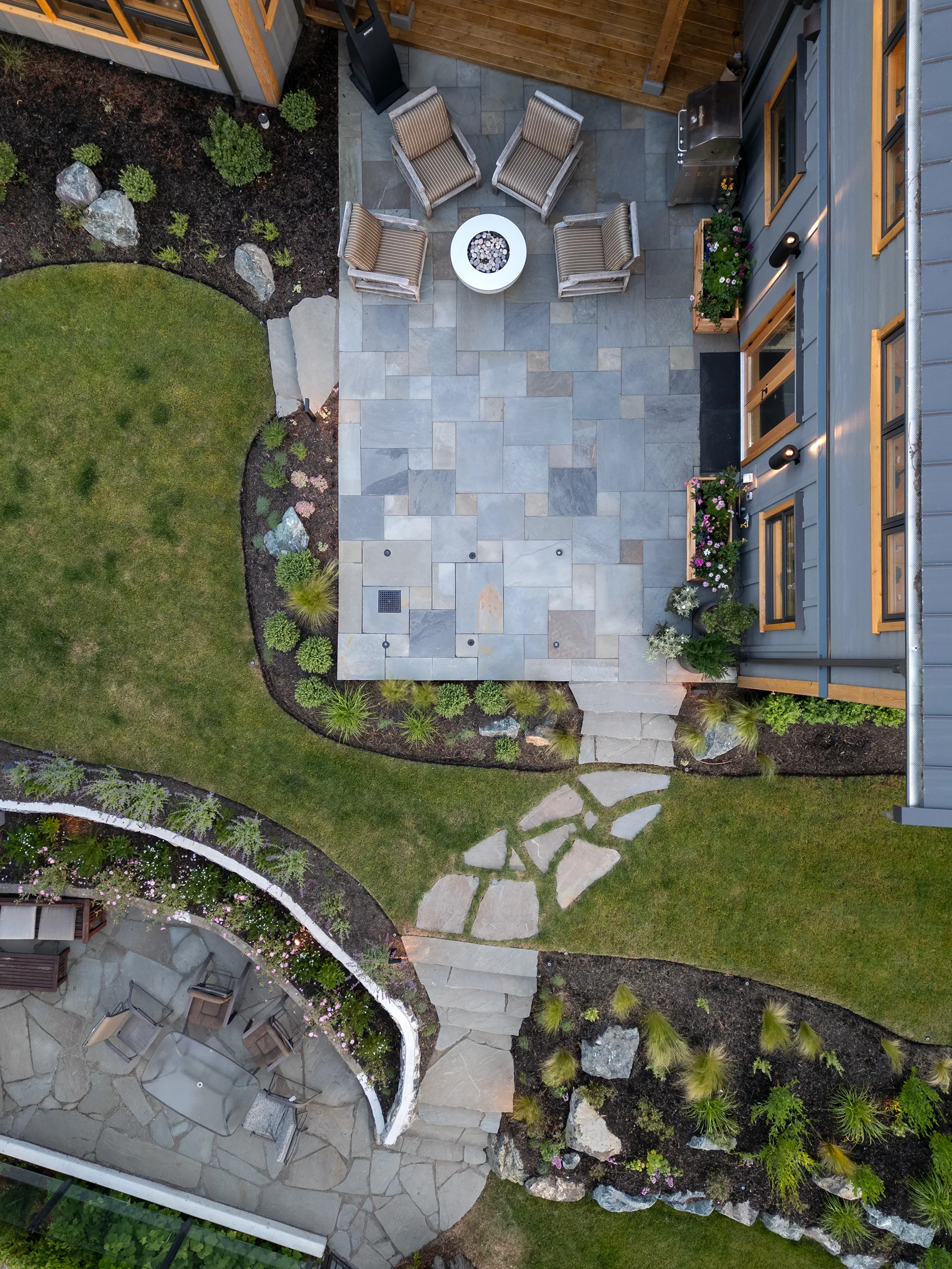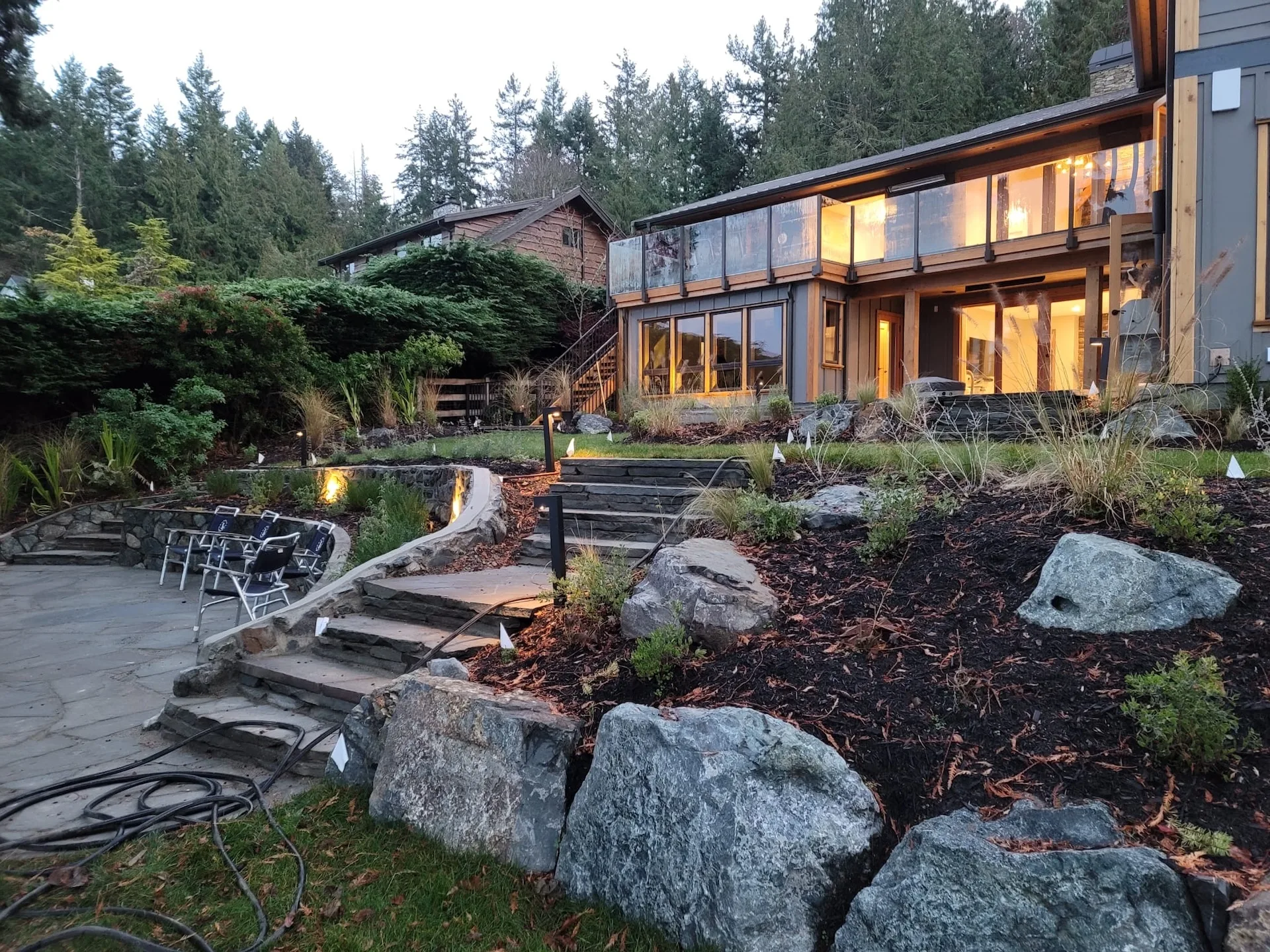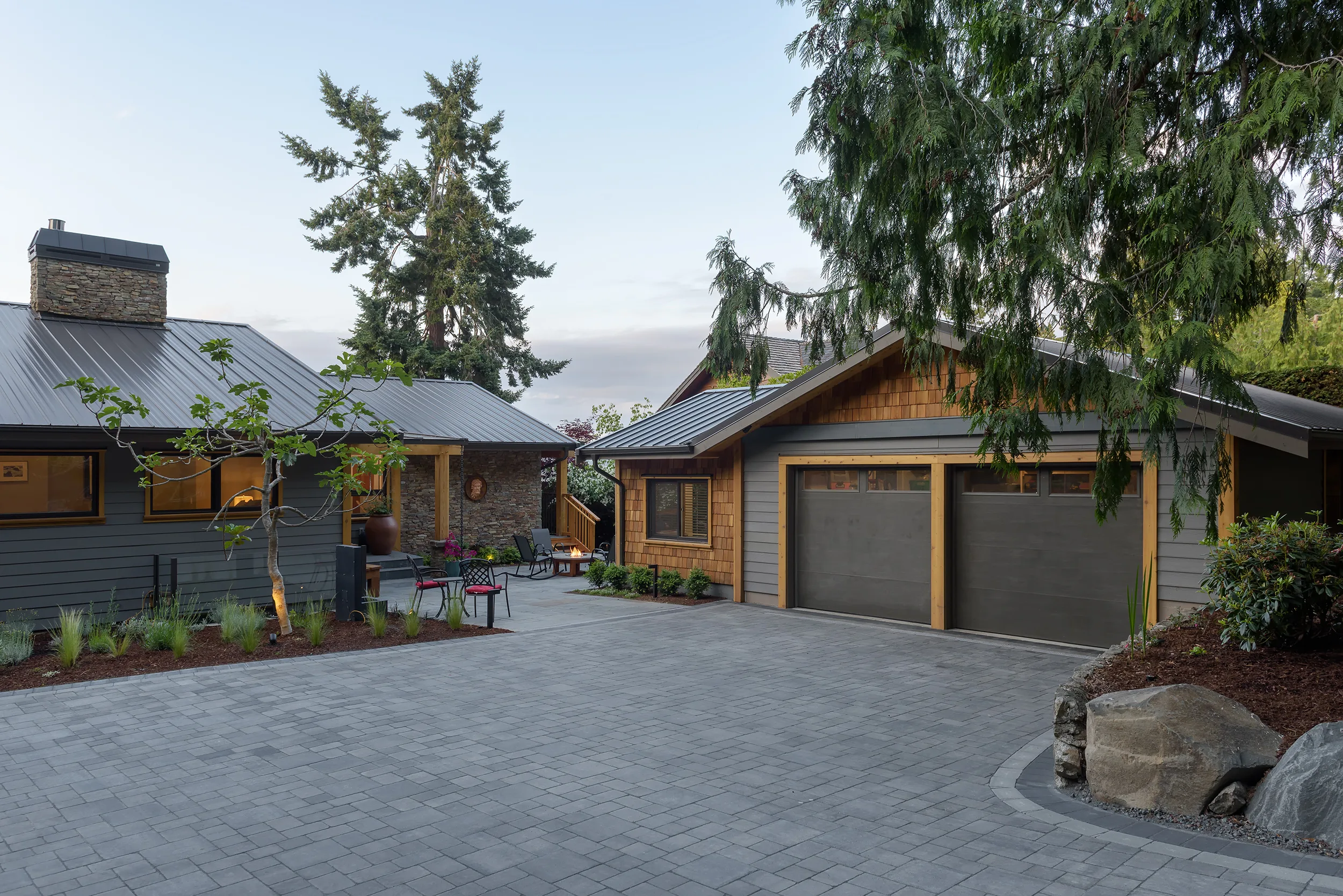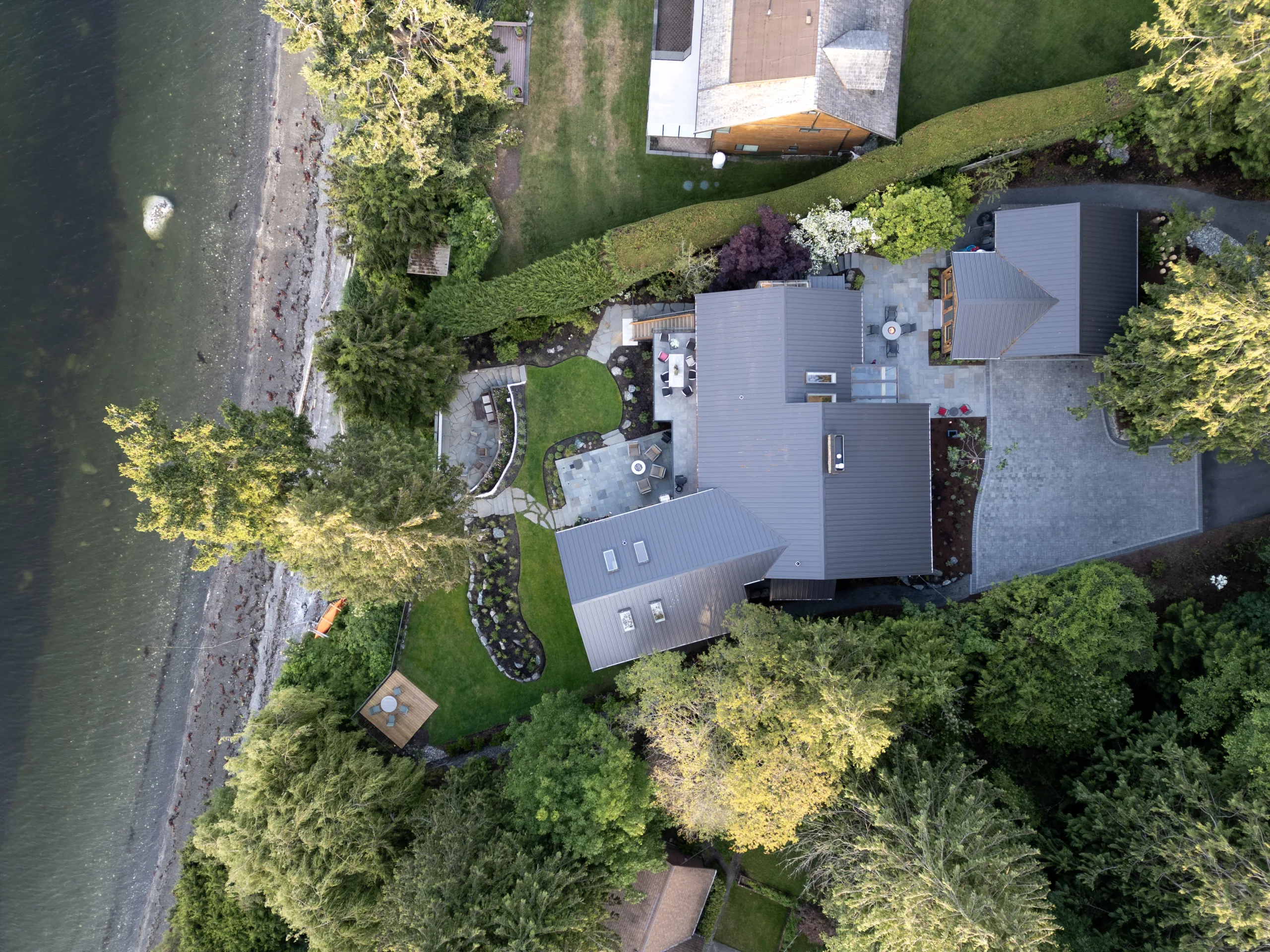 This Cape Cod-style renovation provides a secluded coastal retreat, accessed through a winding driveway that meanders beneath a canopy of towering cedars and ferns. The entryway is defined by meticulously fitted bluestone in an ashlar pattern, leading to a series of basalt risers that descend toward a lower patio. Here, a thoughtfully designed outdoor living space awaits, complete with a built-in fire pit, BBQ area, and splash pad, offering a perfect balance of relaxation and entertainment. The natural surroundings enhance the sense of privacy, while the integration of classic coastal elements ensures a timeless aesthetic. Blending West Coast beauty with Cape Cod charm, this waterfront sanctuary is both inviting and enduring.