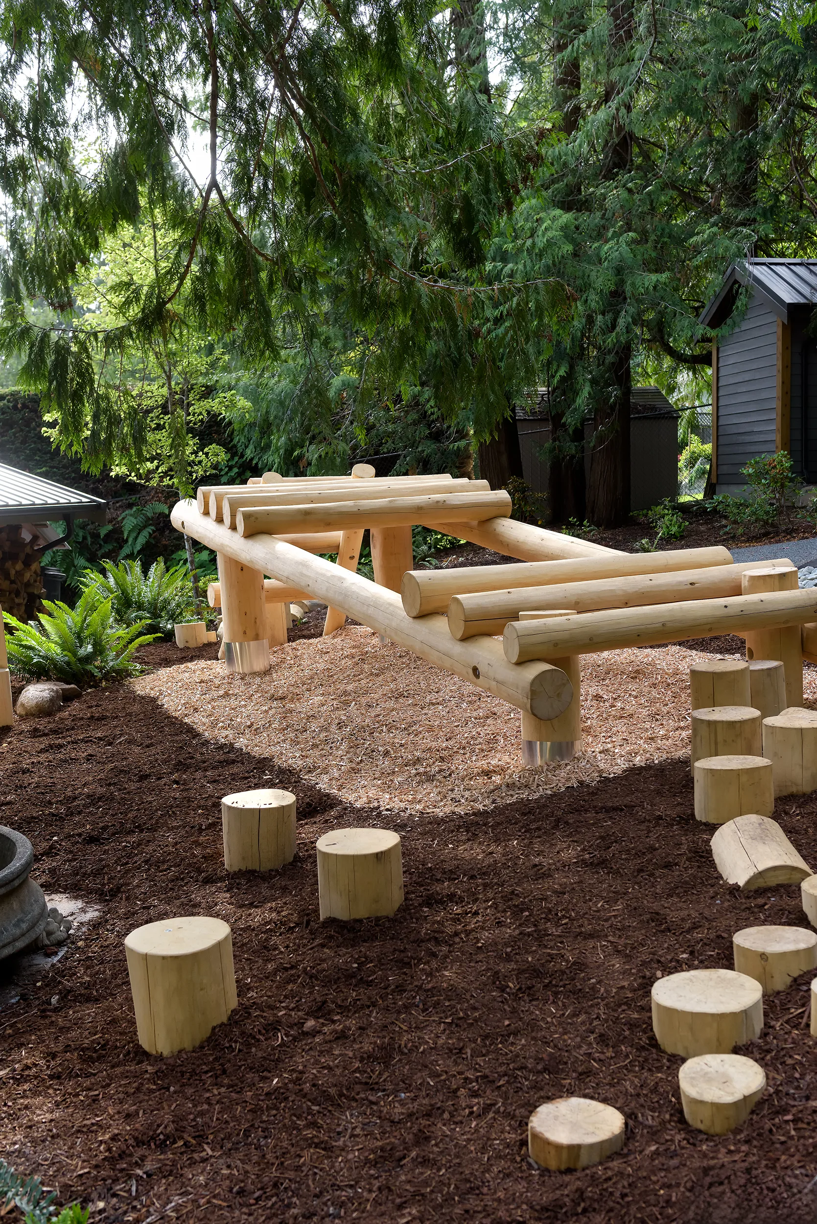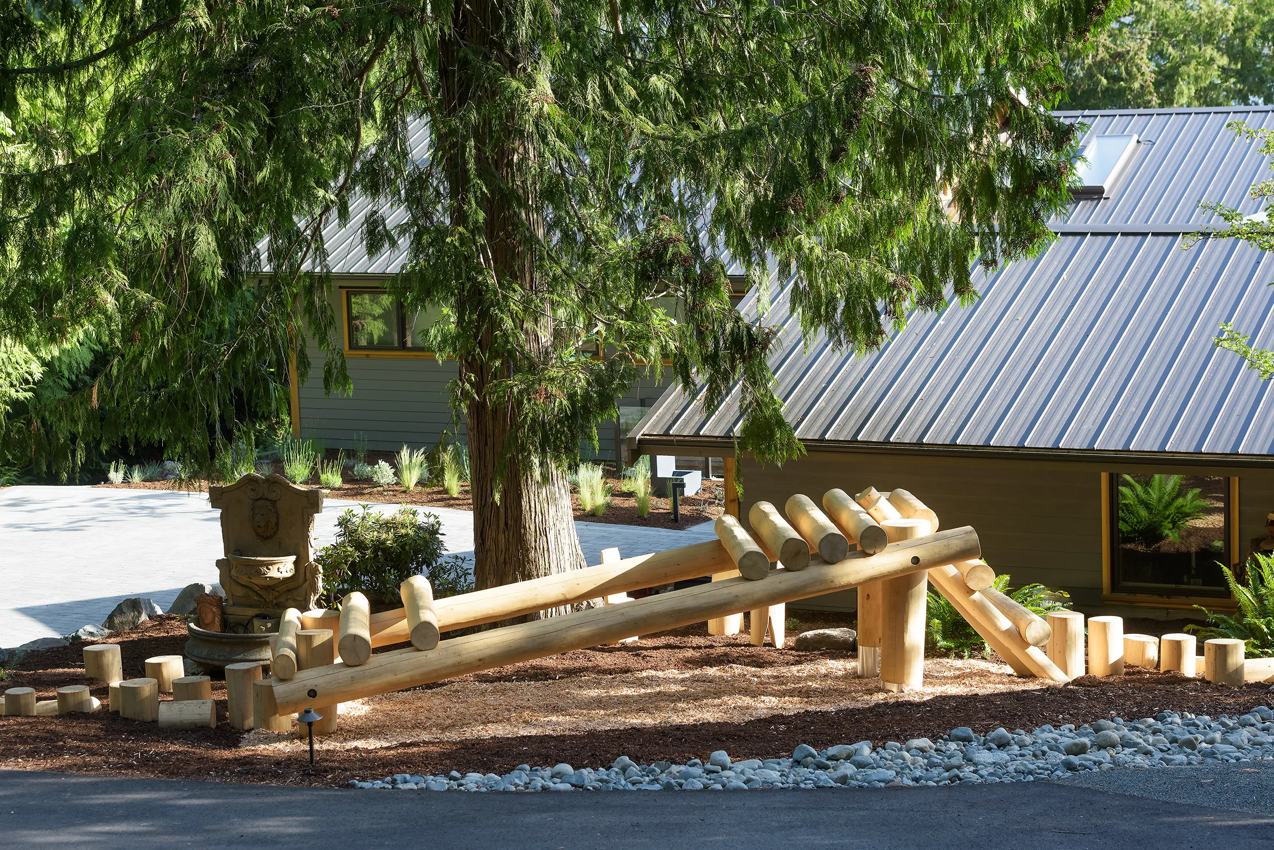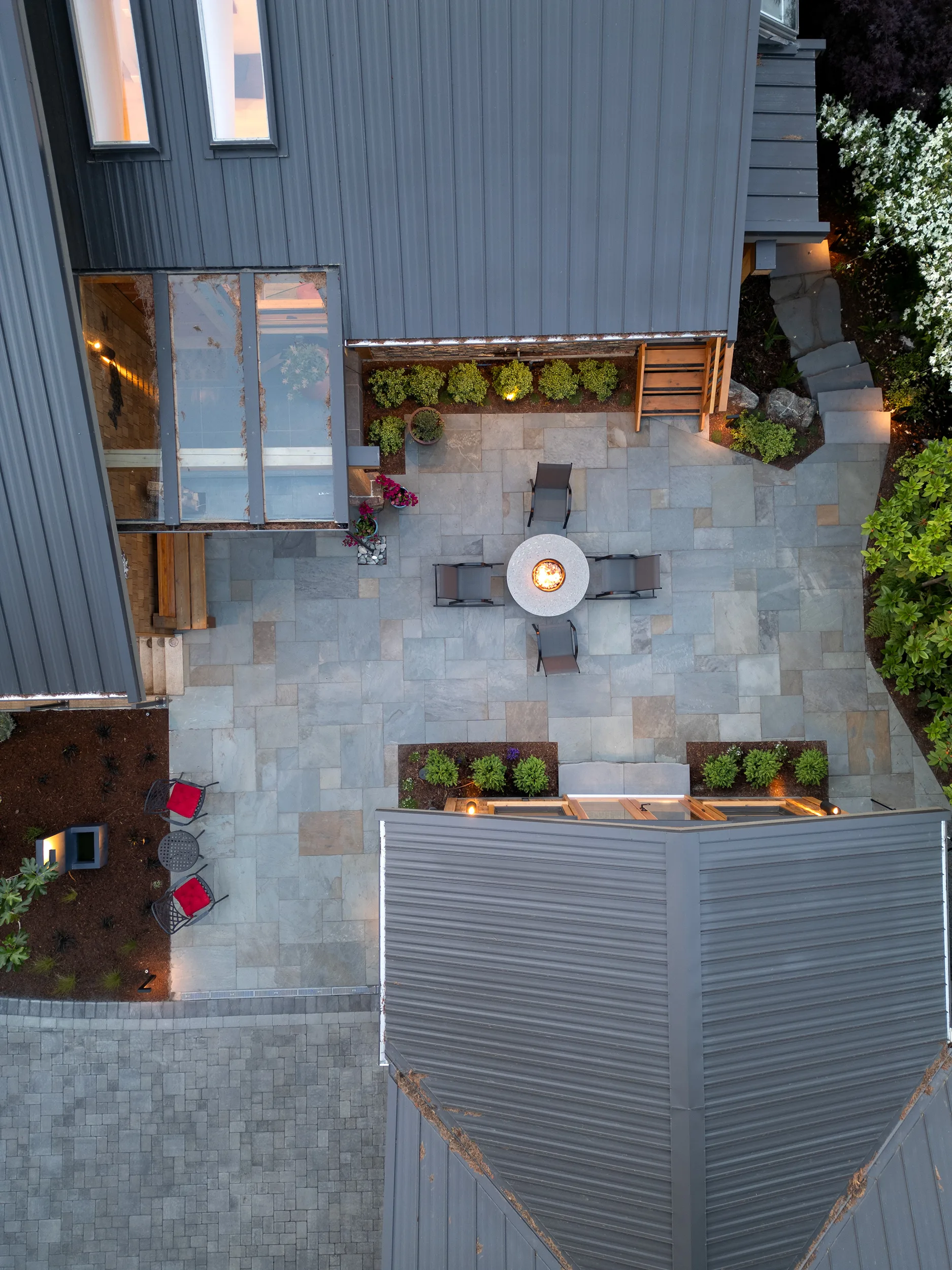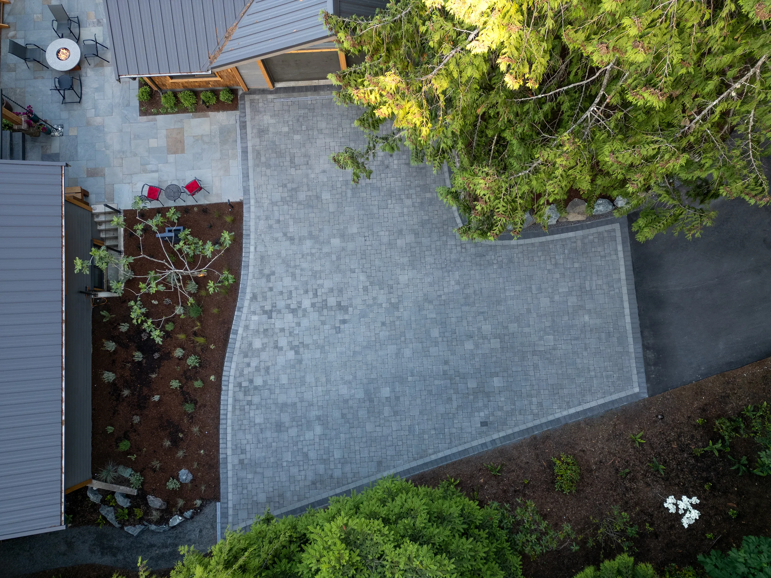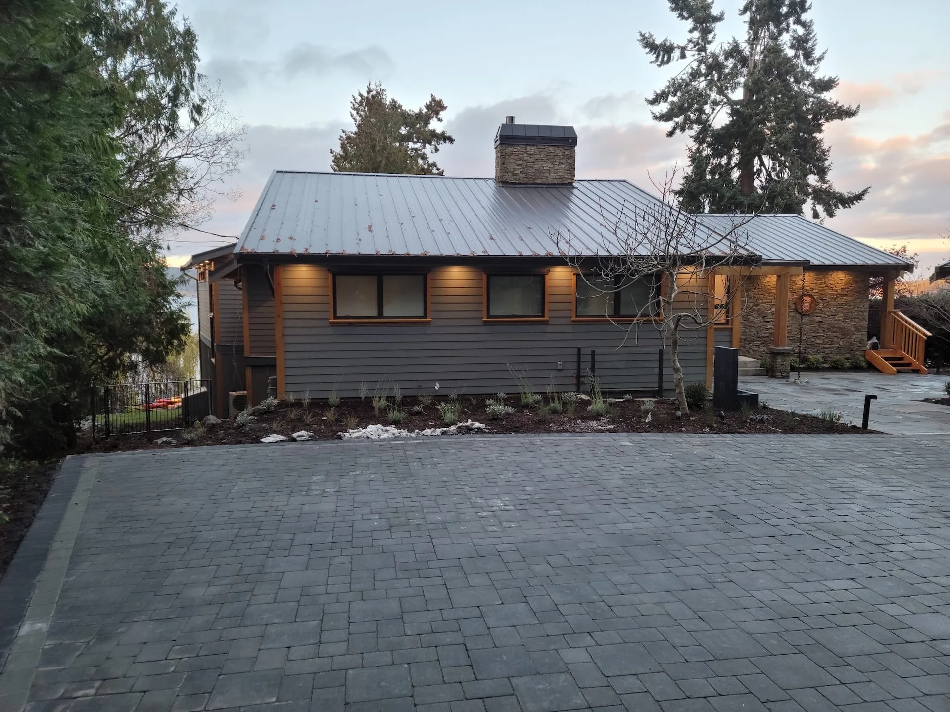 This Cape Cod-style renovation provides a secluded coastal retreat, accessed through a winding driveway that meanders beneath a canopy of towering cedars and ferns. The entryway is defined by meticulously fitted bluestone in an ashlar pattern, leading to a series of basalt risers that descend toward a lower patio. Here, a thoughtfully designed outdoor living space awaits, complete with a built-in fire pit, BBQ area, and splash pad, offering a perfect balance of relaxation and entertainment. The natural surroundings enhance the sense of privacy, while the integration of classic coastal elements ensures a timeless aesthetic. Blending West Coast beauty with Cape Cod charm, this waterfront sanctuary is both inviting and enduring.